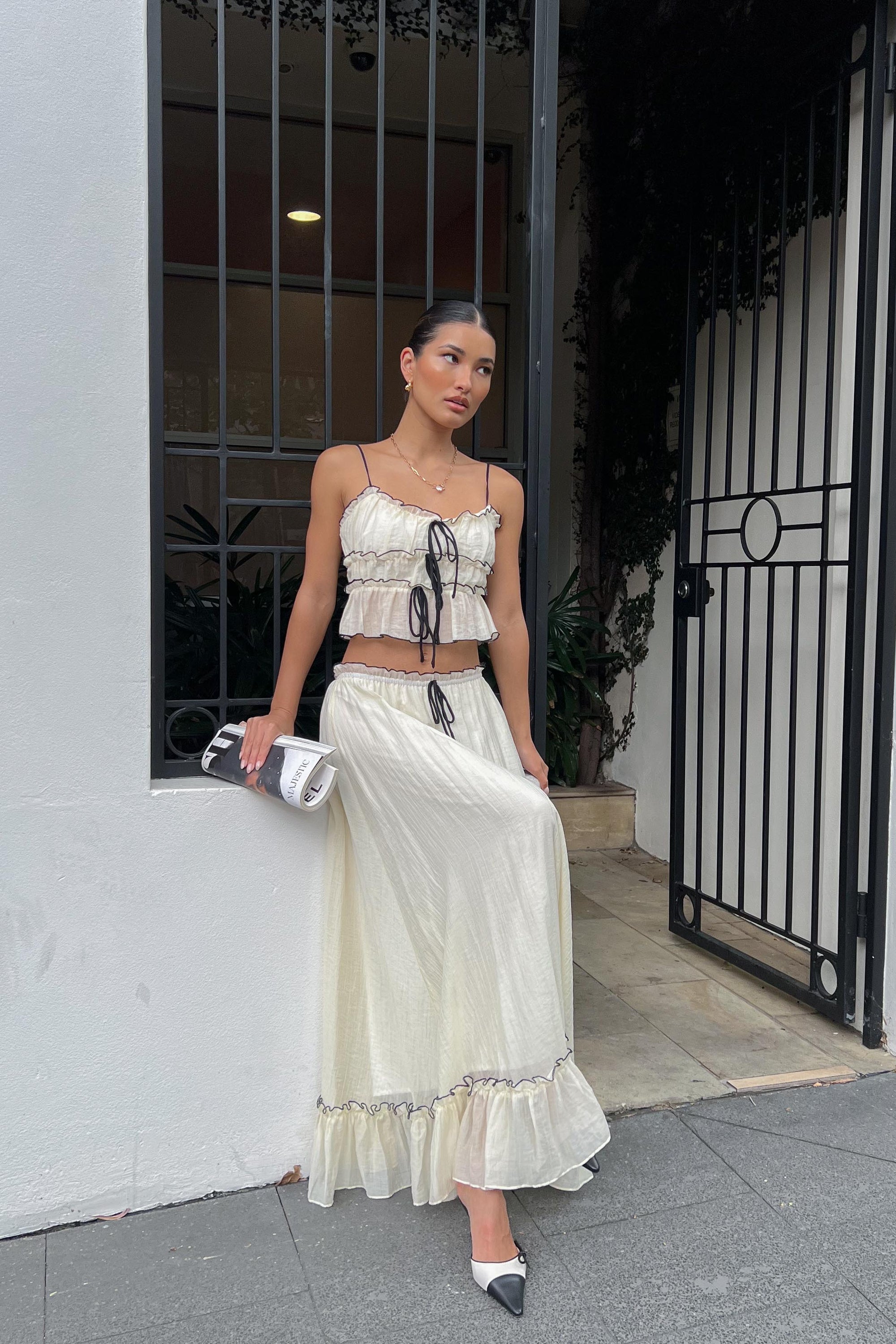 Hello, sunshine! You will steal the show in our super cute Maidens maxi skirt. Featuring contrasting overlock stitching and tie in the hem. It's perfect for weekend brunch with your besties teamed with sandals and its matching top for a dreamy look.