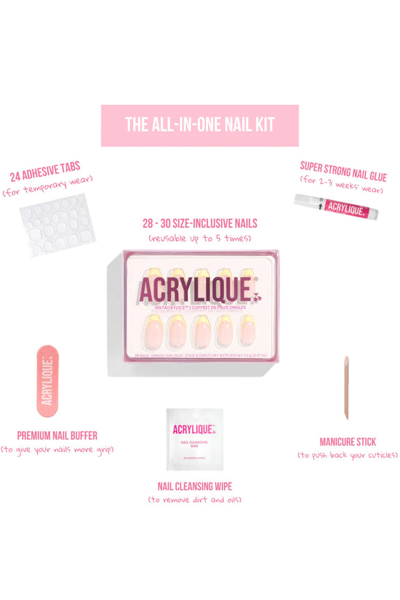 Say hello to Instacrylics™ by ACRYLIQUE. Designed to add a pop of color and personality to your look, they're perfect for a flirty date night or brunch with your besties! What are Instacrylics™? Instacrylics™ are acrylics that can be quickly and easily applied at home in under 10 minutes! You can wear them as is, or file and shape them to your desired preference. With a choice of two application methods, these acrylics can last for up to 2 weeks if applied with glue, or up to 5 days if applied with adhesive tabs, and can be reused if removed with care. Got last minute weekend plans? Haven’t had time to squeeze in a nail appointment? Or want to have a fresh set of nails but need to remove them for work? Instacrylics™ will have you looking fresh out of the nail salon ready in no time, so you can head straight to the bar for that cheeky drink! How to apply your Instacrylics™: Match acrylic nails using size guides underneath nail tips. Clip natural nails, buff surface and push cuticles back. Clean nails with alcohol pad and allow to dry. Apply a generous layer of glue or adhesive tab (depending on preferred method) onto clean nail. Align acrylic nail with cuticle and press down firmly for 20 seconds.