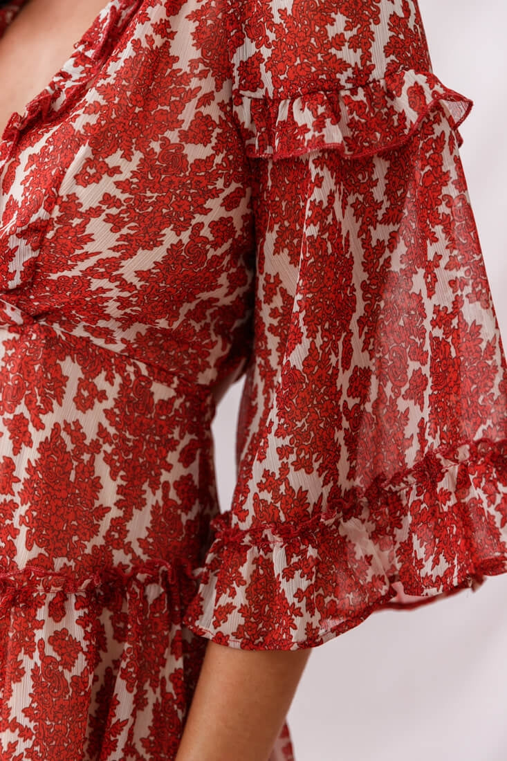 Turn heads wherever you go in this super cute dress featuring ruffle-fringed, billowy 3/4 bell sleeves, a tiered ruffle skirt and our favorite part, the lace-up back! We are loving the soft, floaty chiffon fabric. Perfect for your next event or lunch with your gal pals. Team it with single strap black heels or pointed-toe flats and a tote. Style queen!