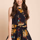 Colorful flowers bloom on this flowy romper. Beautiful halter neckline and eyelet detail along the base keep this look fresh and fun! Pair with dark colored sneakers.