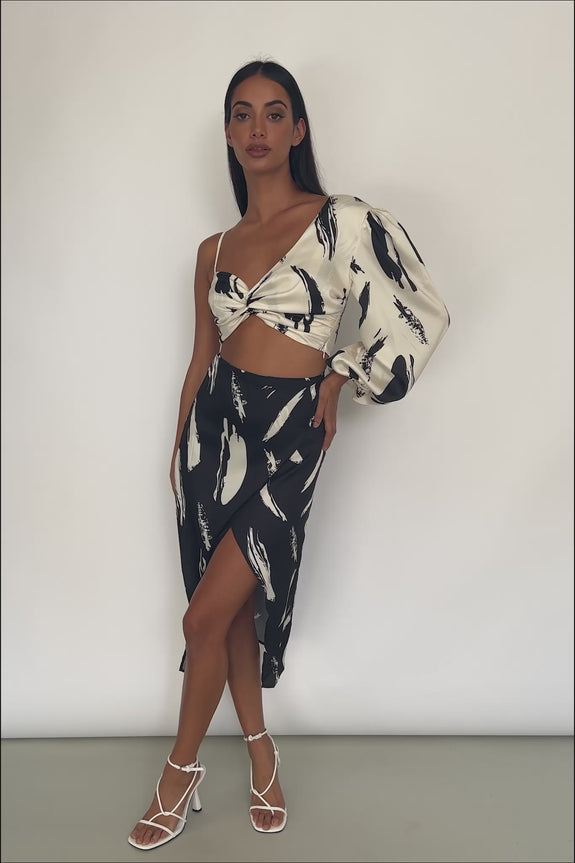 Turn heads in our gorgeous Amina crop top. We are loving its chic, one long sleeve style and twist detail in the bust. Perfect for weekend dinner dates teamed with its matching skirt and mules for a look we are loving.