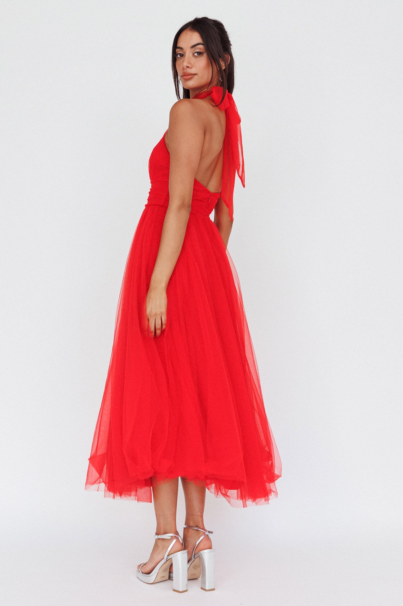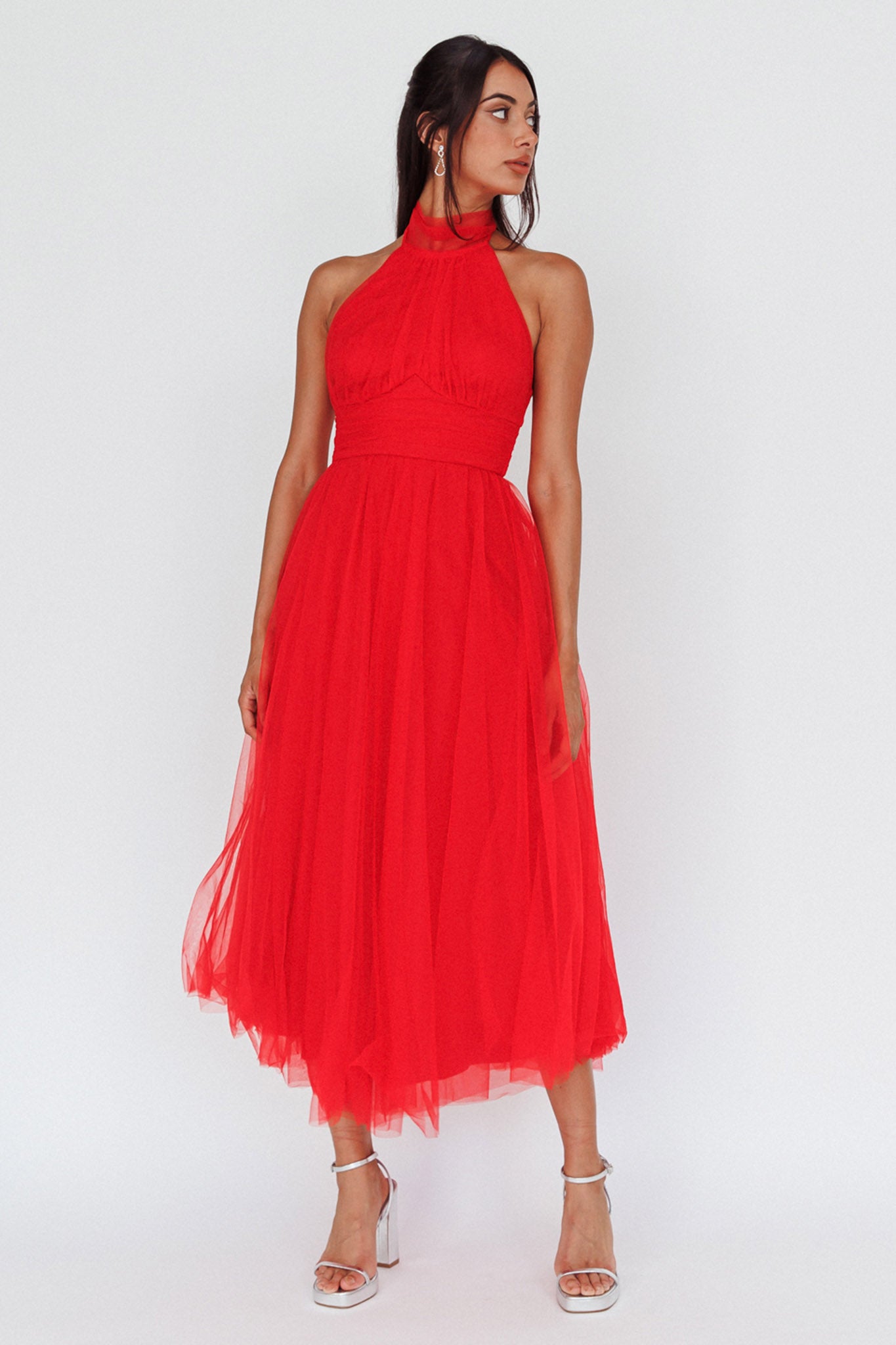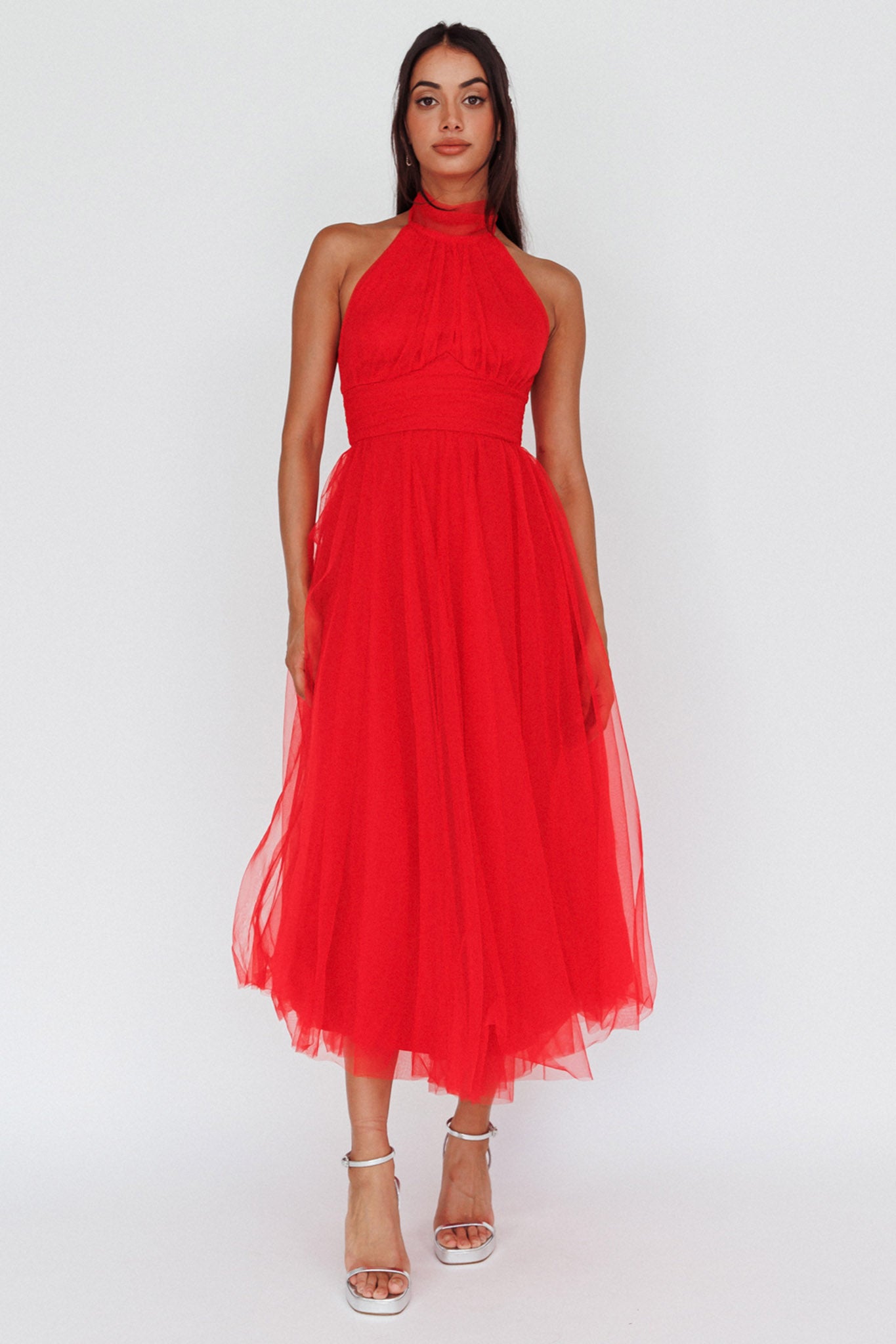 Andria Halterneck Tulle Midi Dress Red