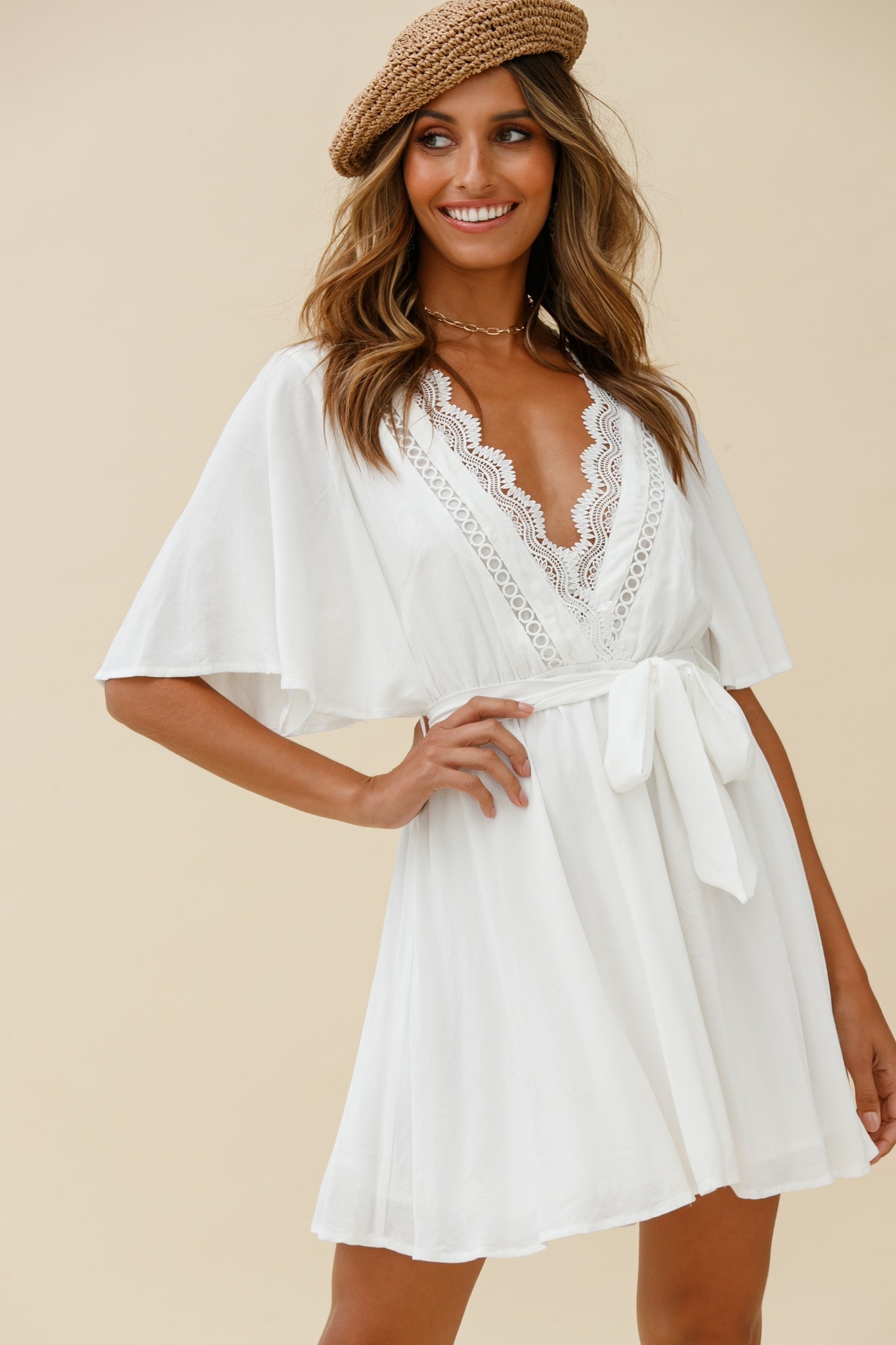 Turn heads in our ultra chic Angela dress. Featuring the most gorgeous lace-trimmed bust and floaty angel sleeves. Wear it to work teamed with flats and a tote or dress it up with heels for happy hour with the girls.