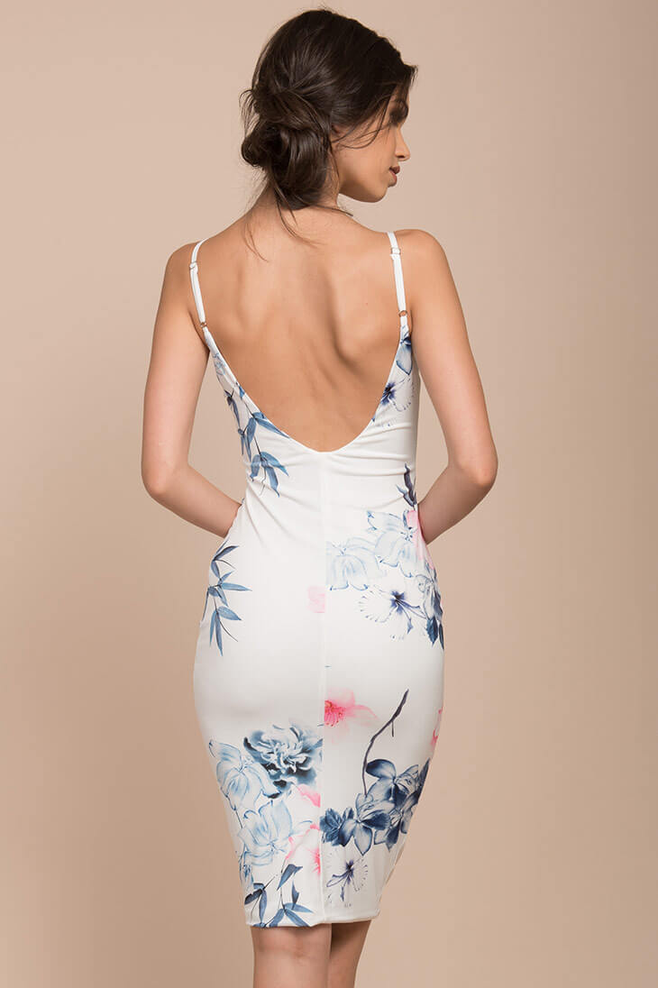 Pretty painted floral print make this bodycon a dream come true. Pair with white sandals and cute, statement earrings.
