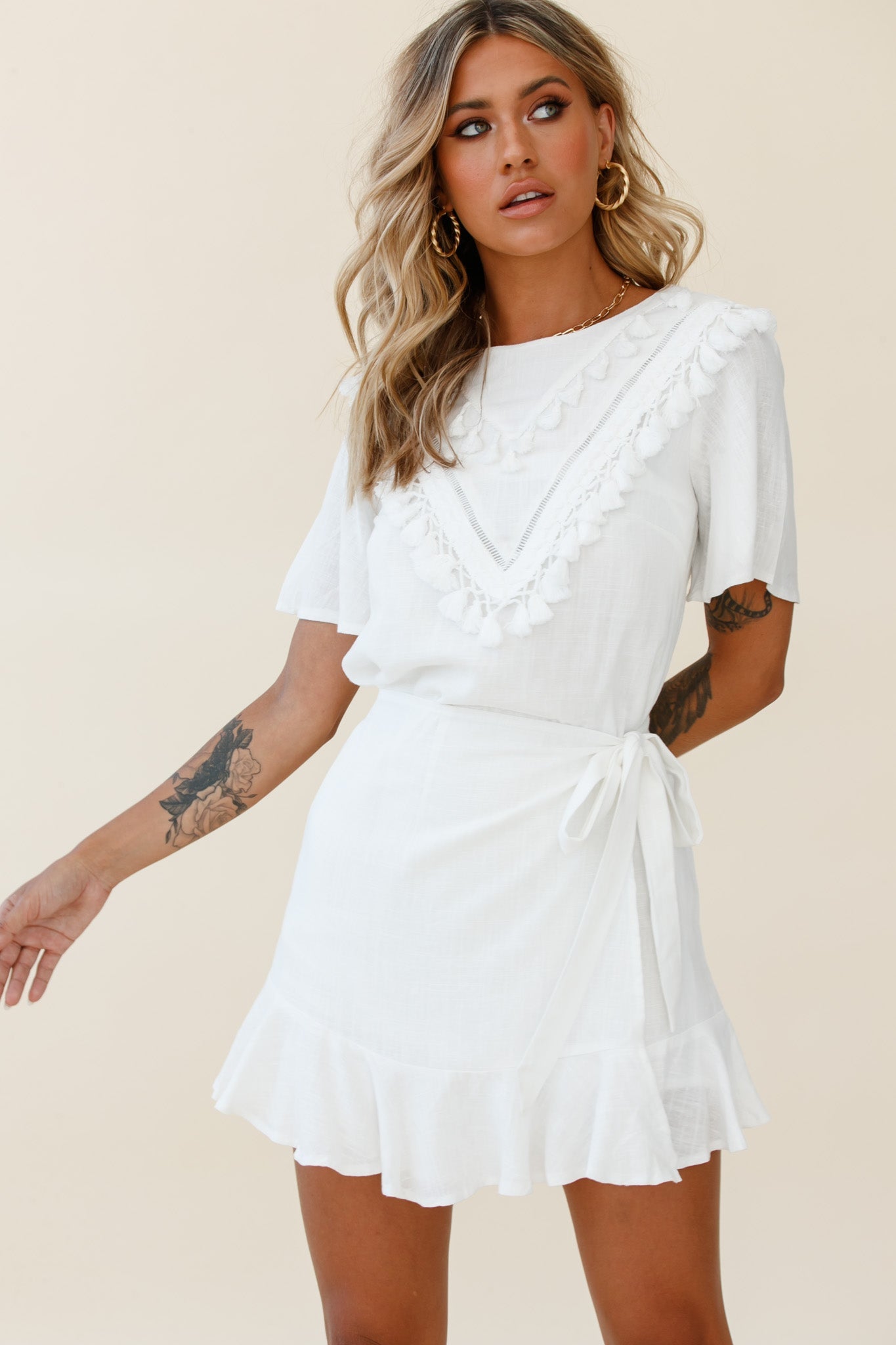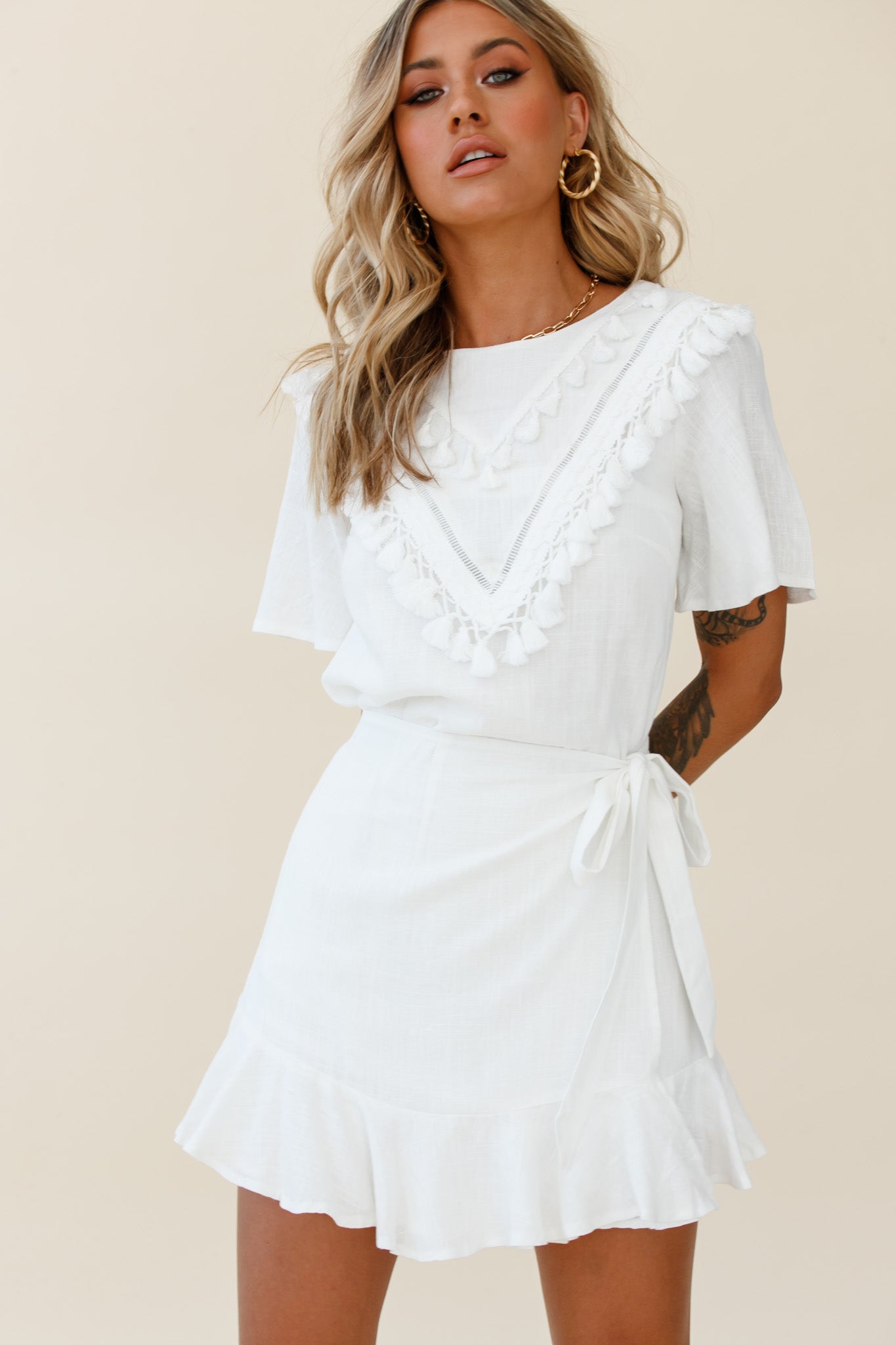 You'll go straight to the best-dressed list in our pretty Angelique dress. We are loving the pretty tassel trim feature in the bust and wrap style bottom. Perfect for looking ultra chic at the office or catching up with your besties at your fave lunch spot. Team it with mules and a tote for a look we are loving.