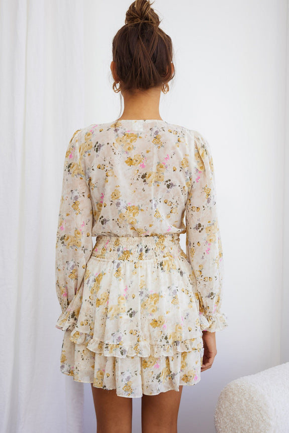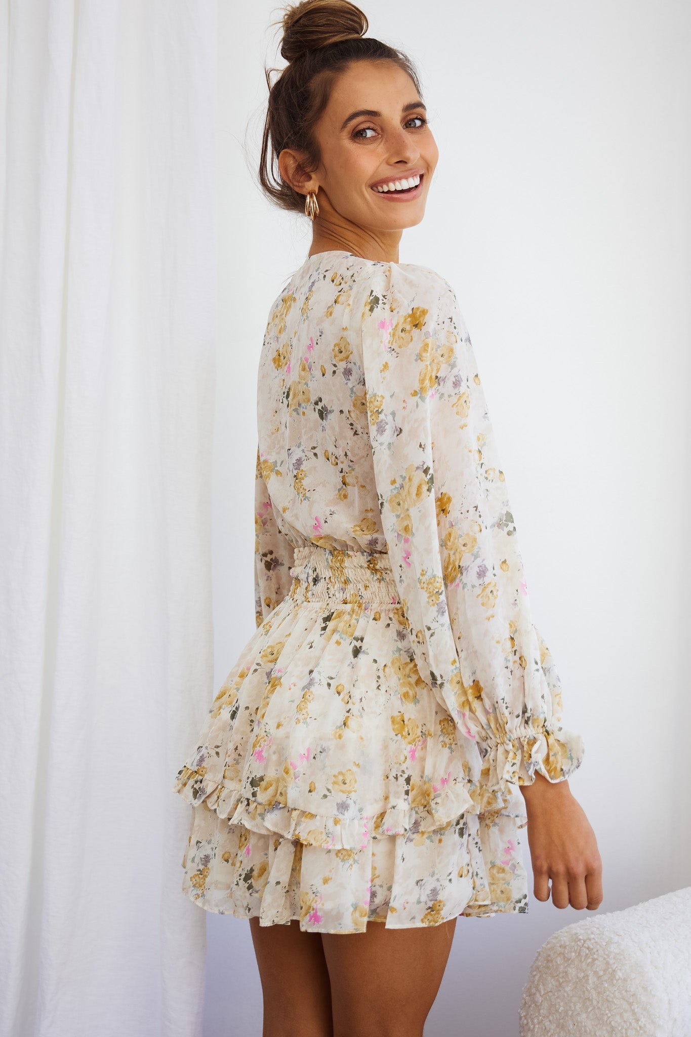 Anthea Bow-Tie Front Layered Frill Dress Vintage Floral Print Beige