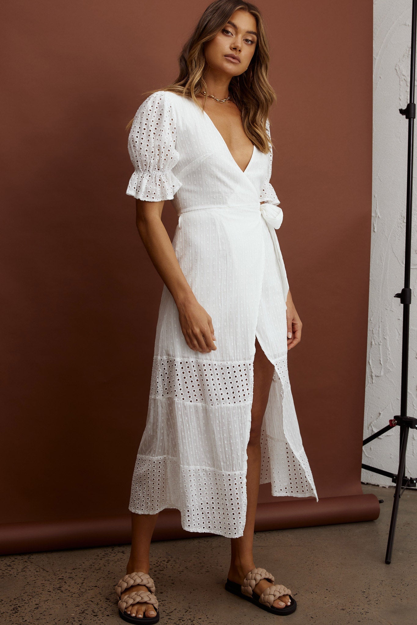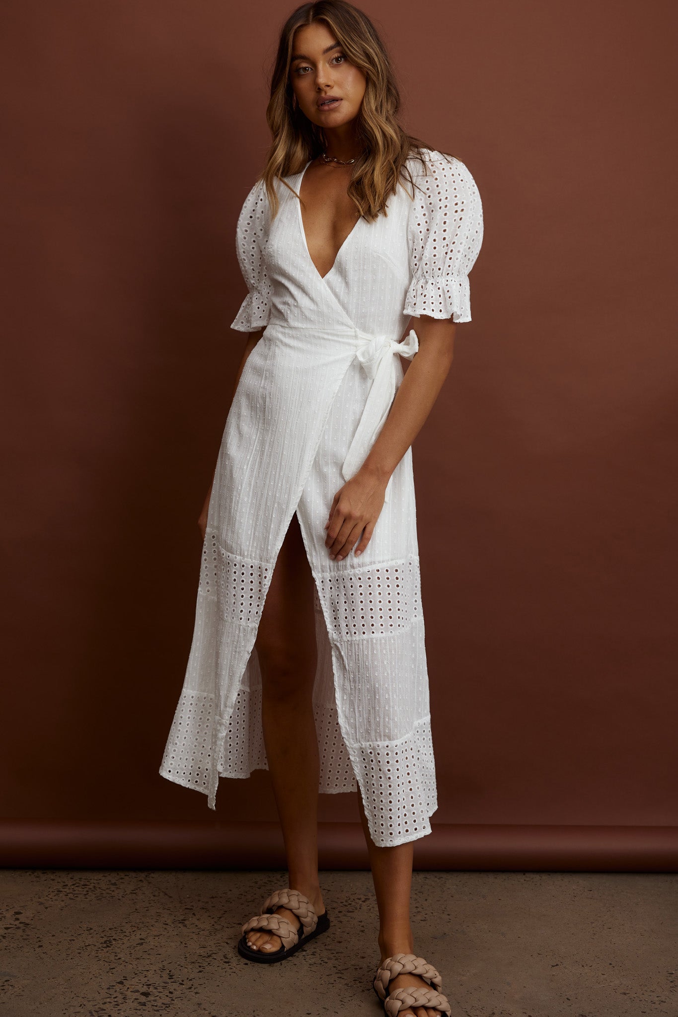 Breeze through your day in our gorgeous Arlington midi dress. We are in love with its chic, wrap style and pretty eyelet embroidering detail in the puff sleeves and skirt. Perfect for looking your Sunday best and hitting up your fave brunch spot with the girls. Team it with leather slides or a kitten heel for a look we are loving.