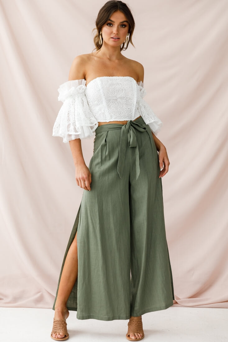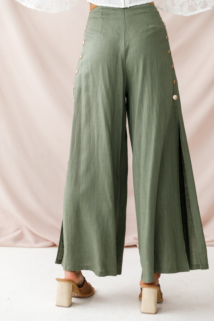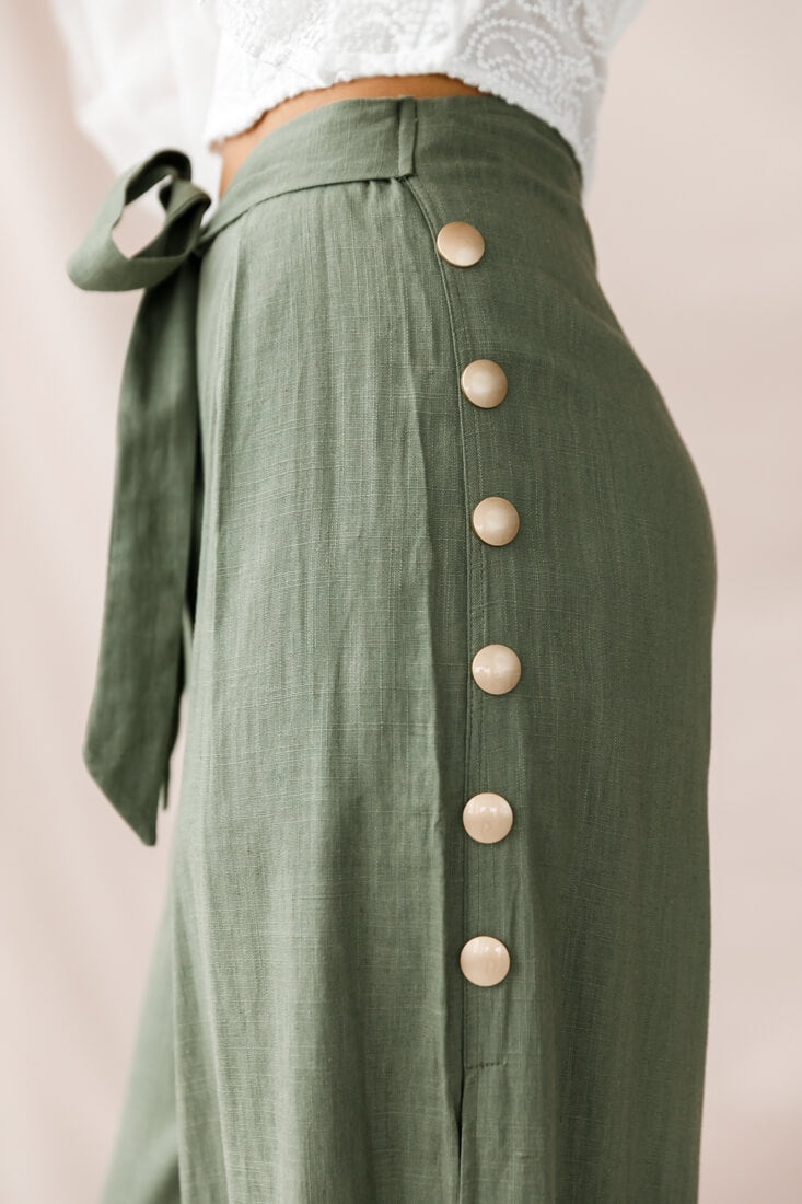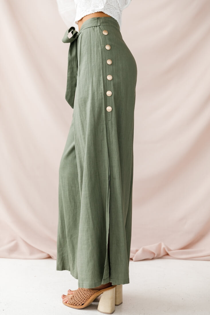Pack your bags because these pants will have you wanting to go on a tropical vacay, stat. Featuring super cute button details down each side hip, followed by a breezy split to show off your tanned pins and an adjustable ribbon tie around the waist, these pants are ultra light and comfortable. Team them with your favorite crop-top and wedges or crochet bikini top, sandals and a pina colada and hit the beach in style!