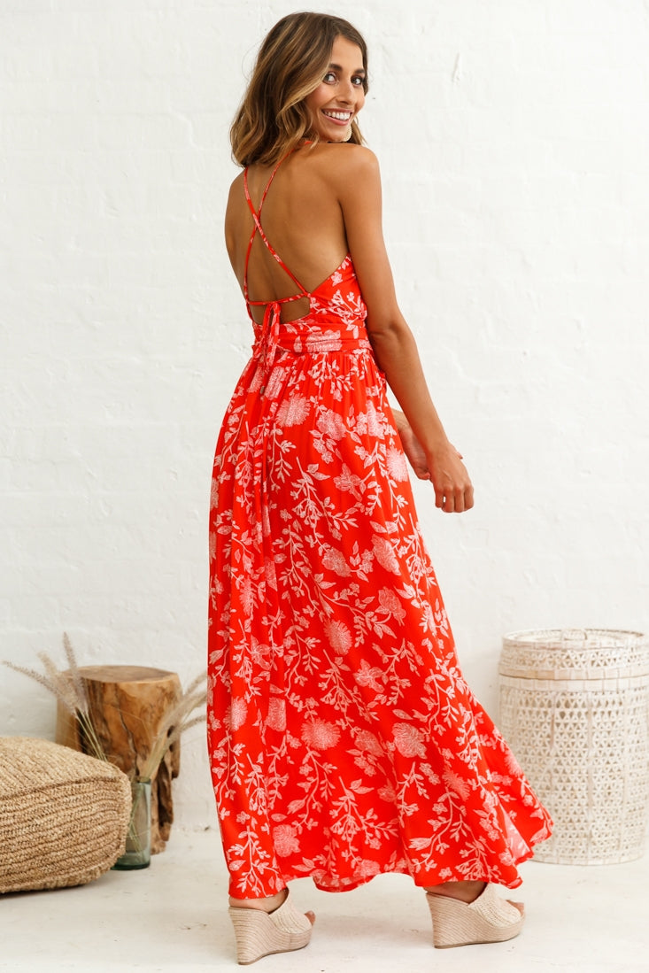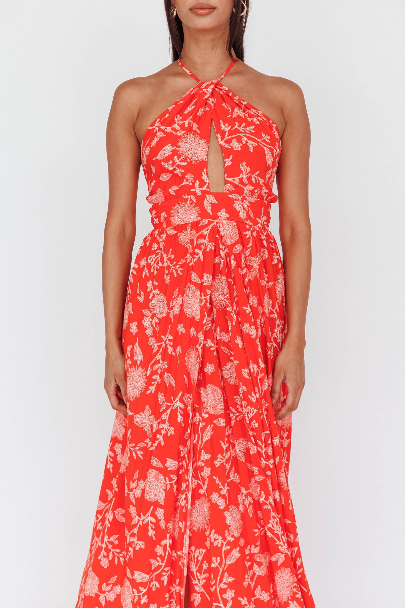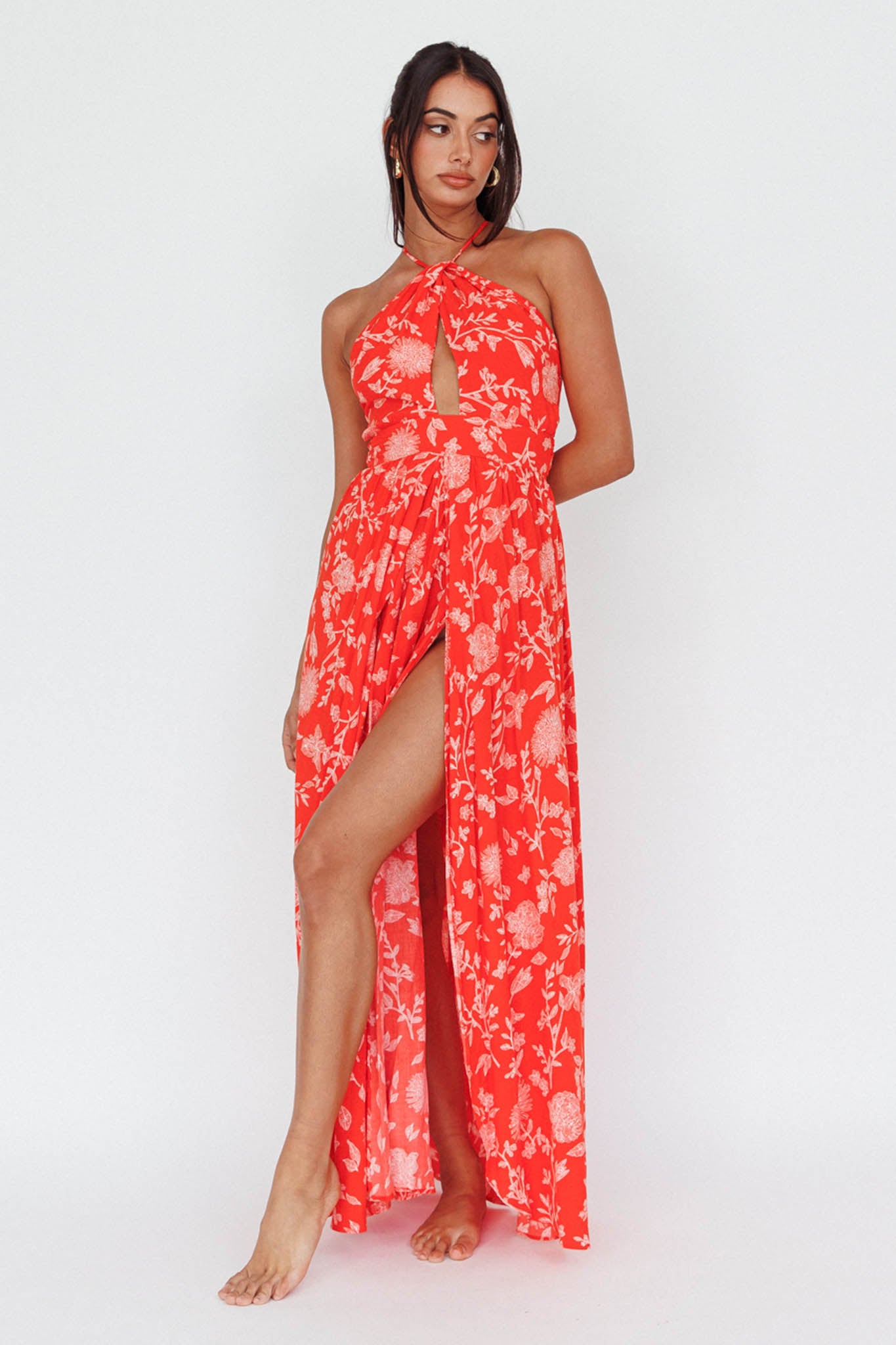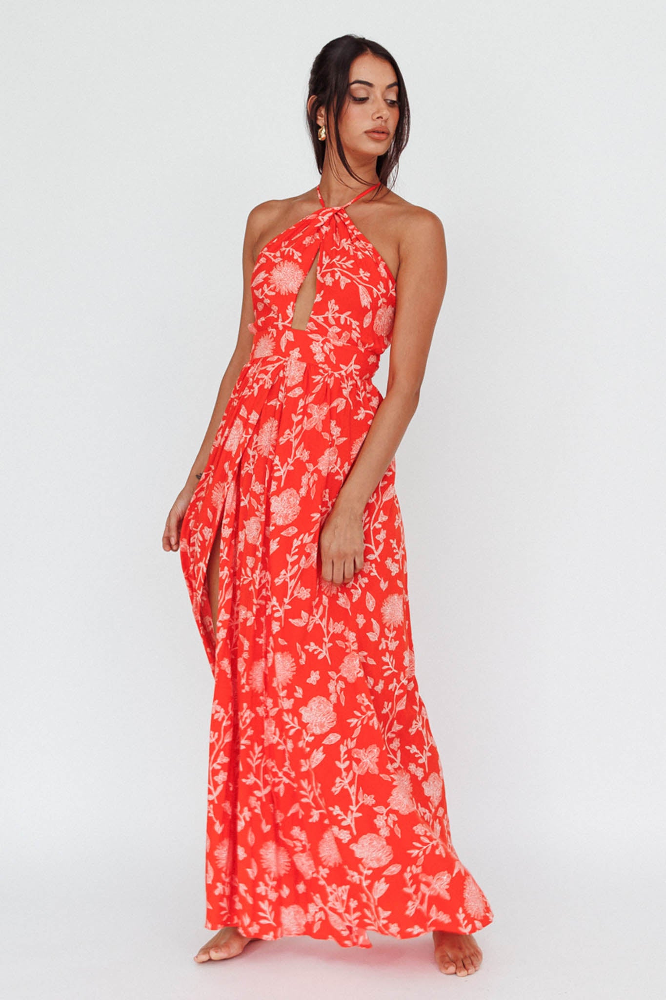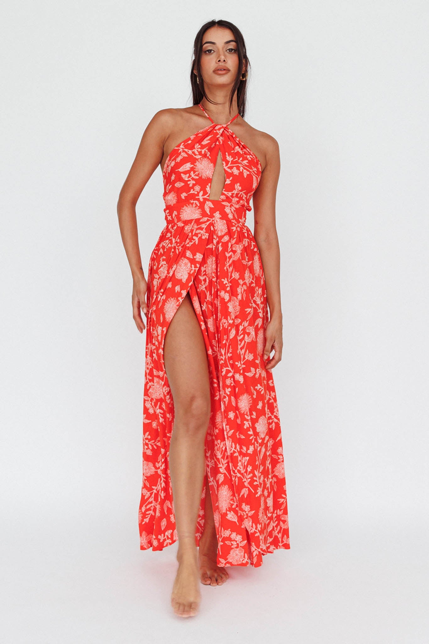 You'll look like a Greek goddess in our stunning Athena dress featuring sexy high splits at the front, halterneck, and strappy, open back. We are loving the feminine floral print fabric that floats with you as you move. Perfect for your next special occasion or drinks at an upscale bar. Team it with nude, strappy heels and gold jewelry and watch heads turn as you strut by.