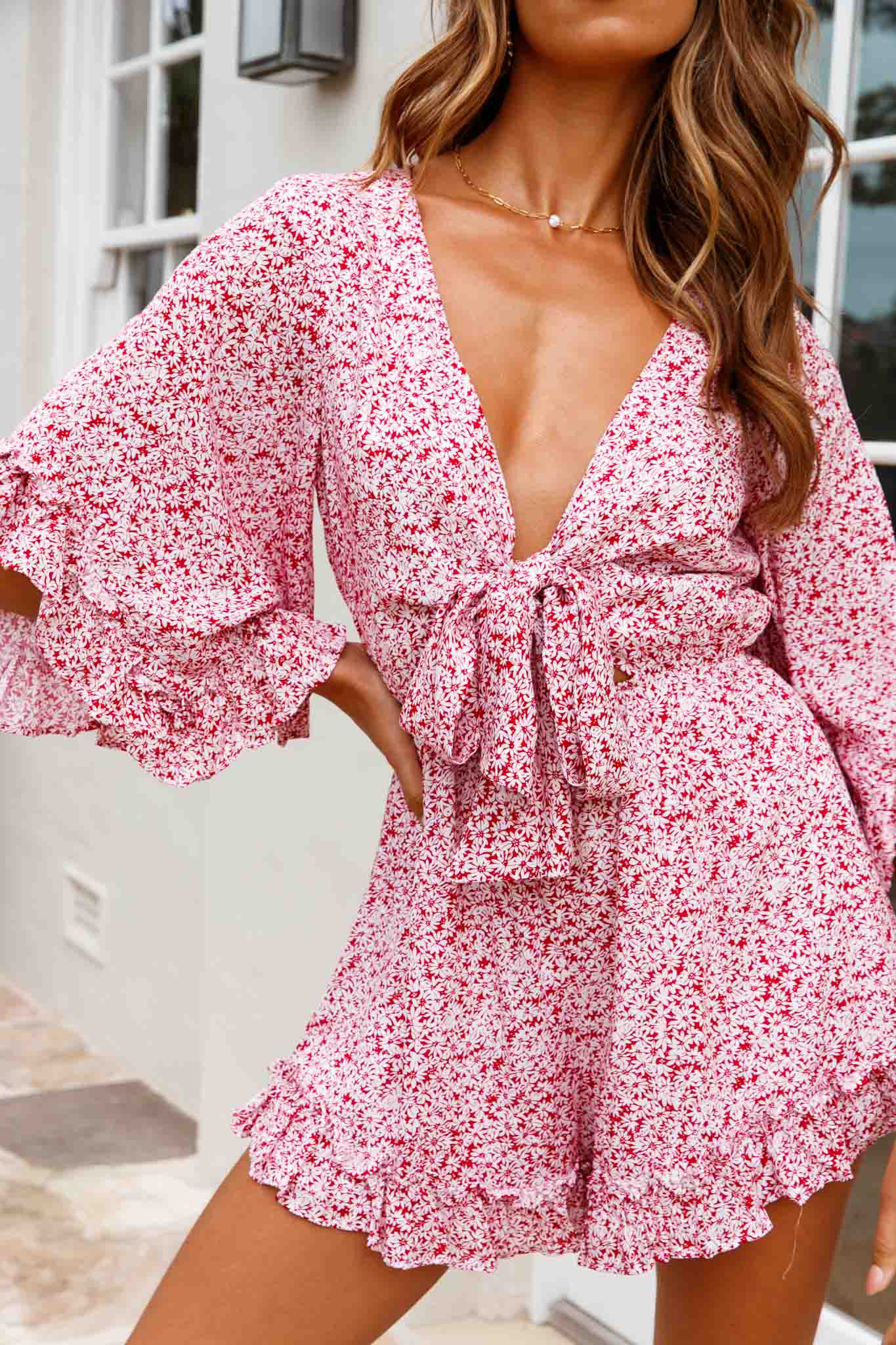 Steal the show in our super cute Athira romper. Perfect for a flirty date with that boy you've had your eye on. We are obsessed with those short, flared sleeves and tied bust! Team it with tan mules and gold hoop earrings and get ready for a second date!