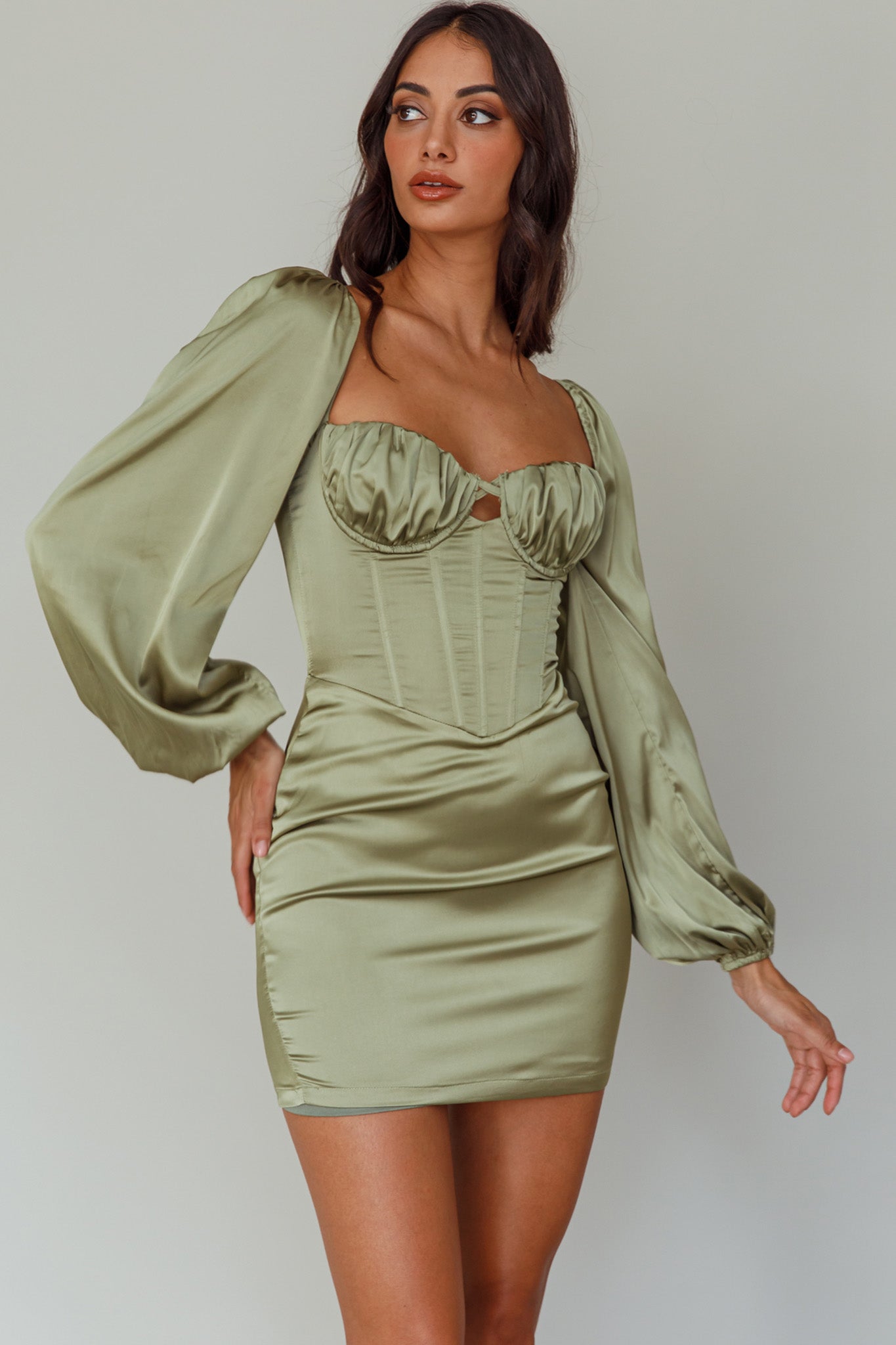 Steal the spotlight in our gorgeous Au Revoir mini dress. Featuring a corset-style bodice and long, balloon sleeves. It's perfect for a girls' night out or special birthday celebration. Team it with gold heels and a clutch for a look that will turn heads.