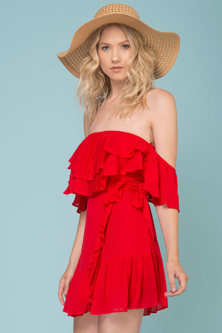 Turn heads in red in the Audrina Ruffled Dress. Strapless of the shoulder dress will have you shining as bright as the sun. Wear with comfy sandals and statement earrings.