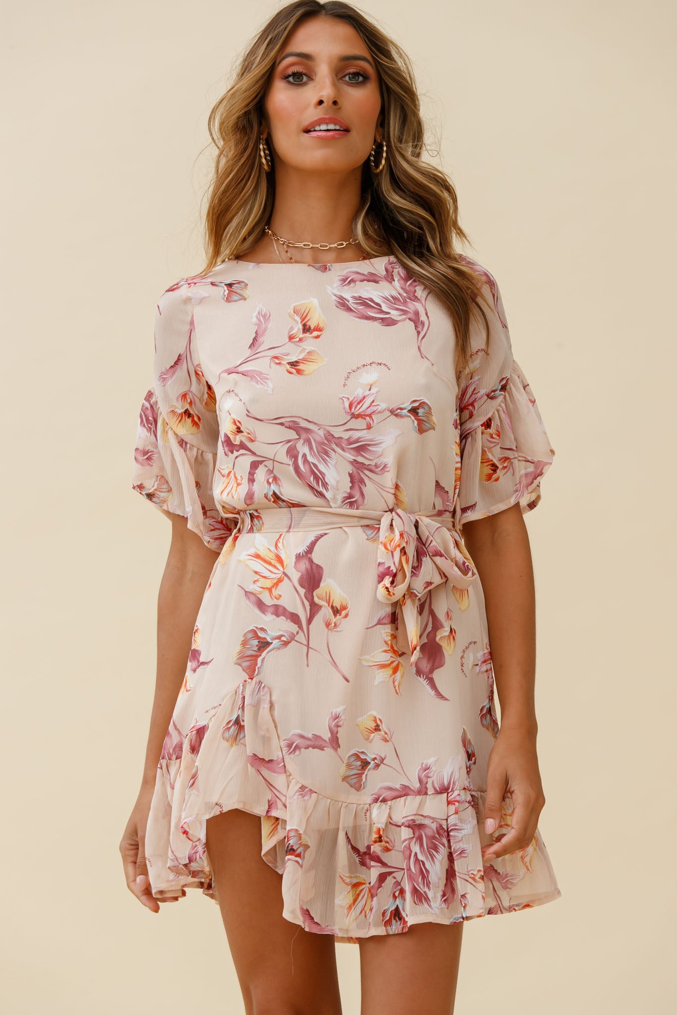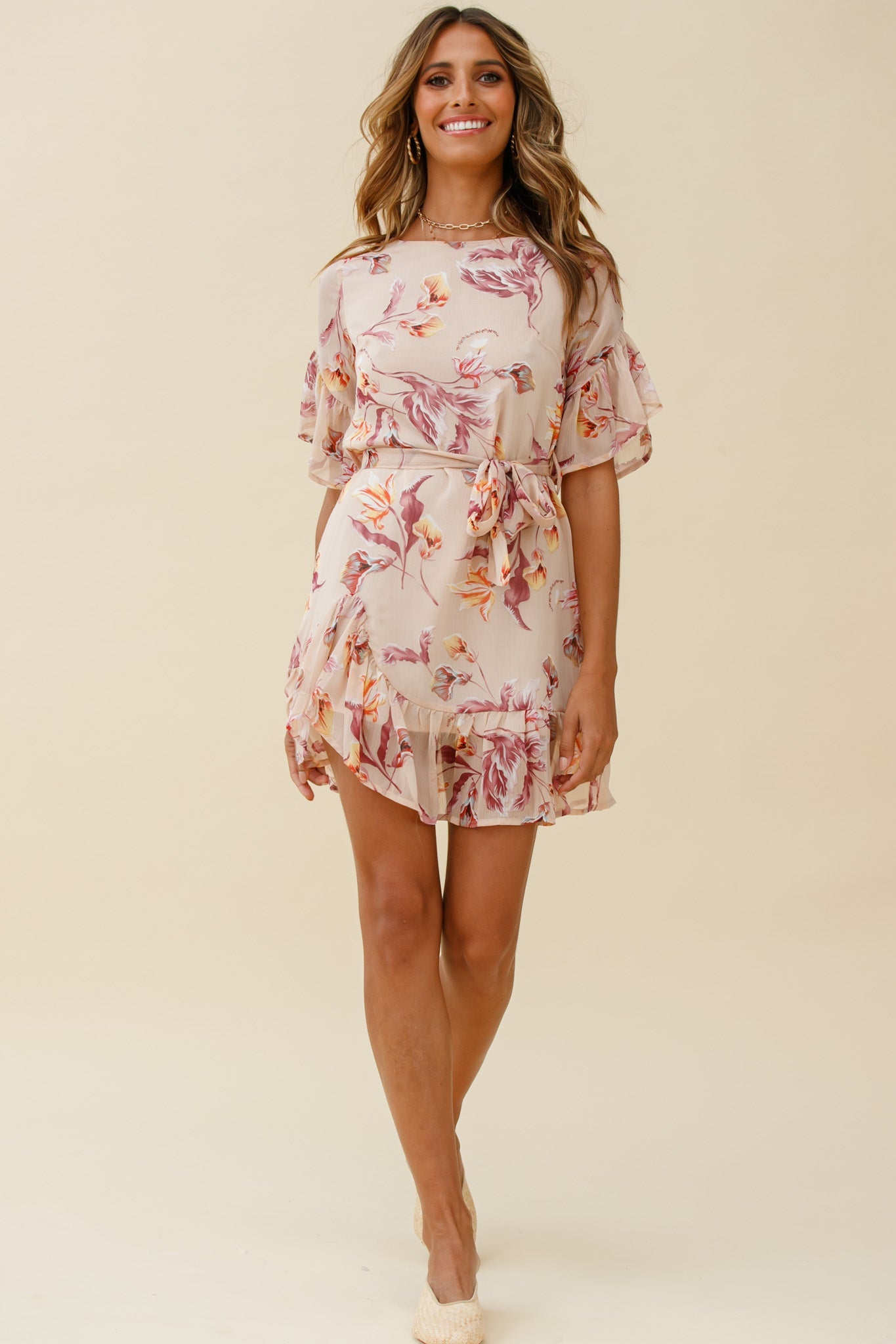 Azealia Ruffle Hem Dress Botanic Print Beige