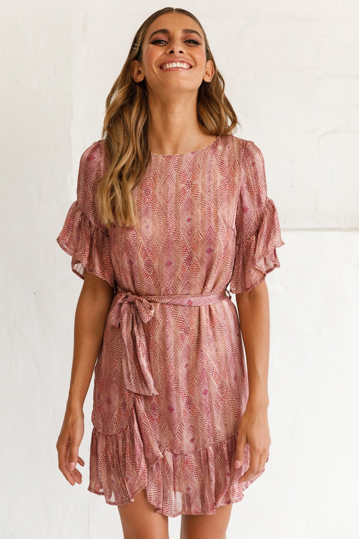 Azealia Ruffle Hem Dress Diamond Print Wine