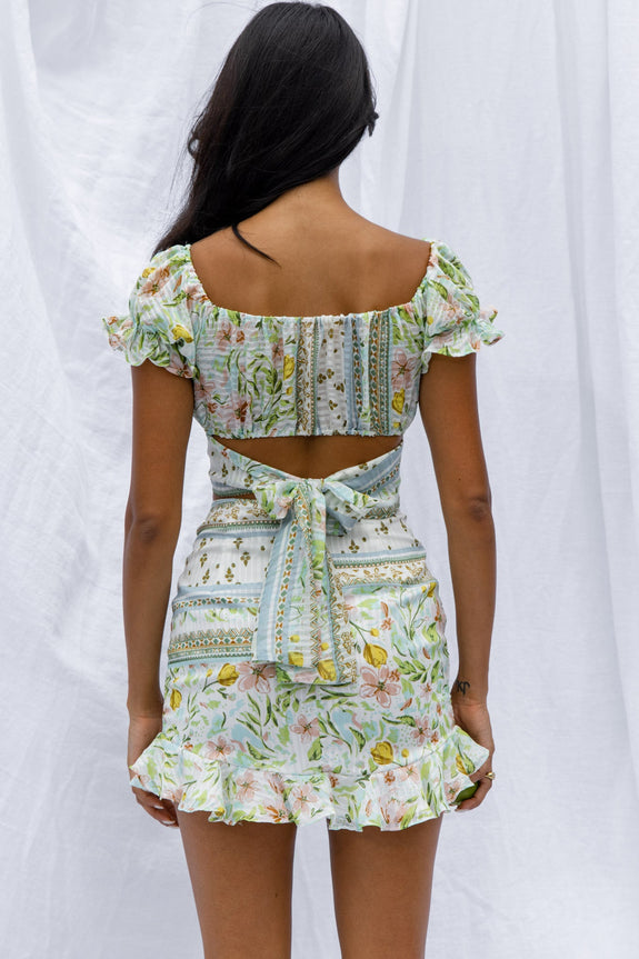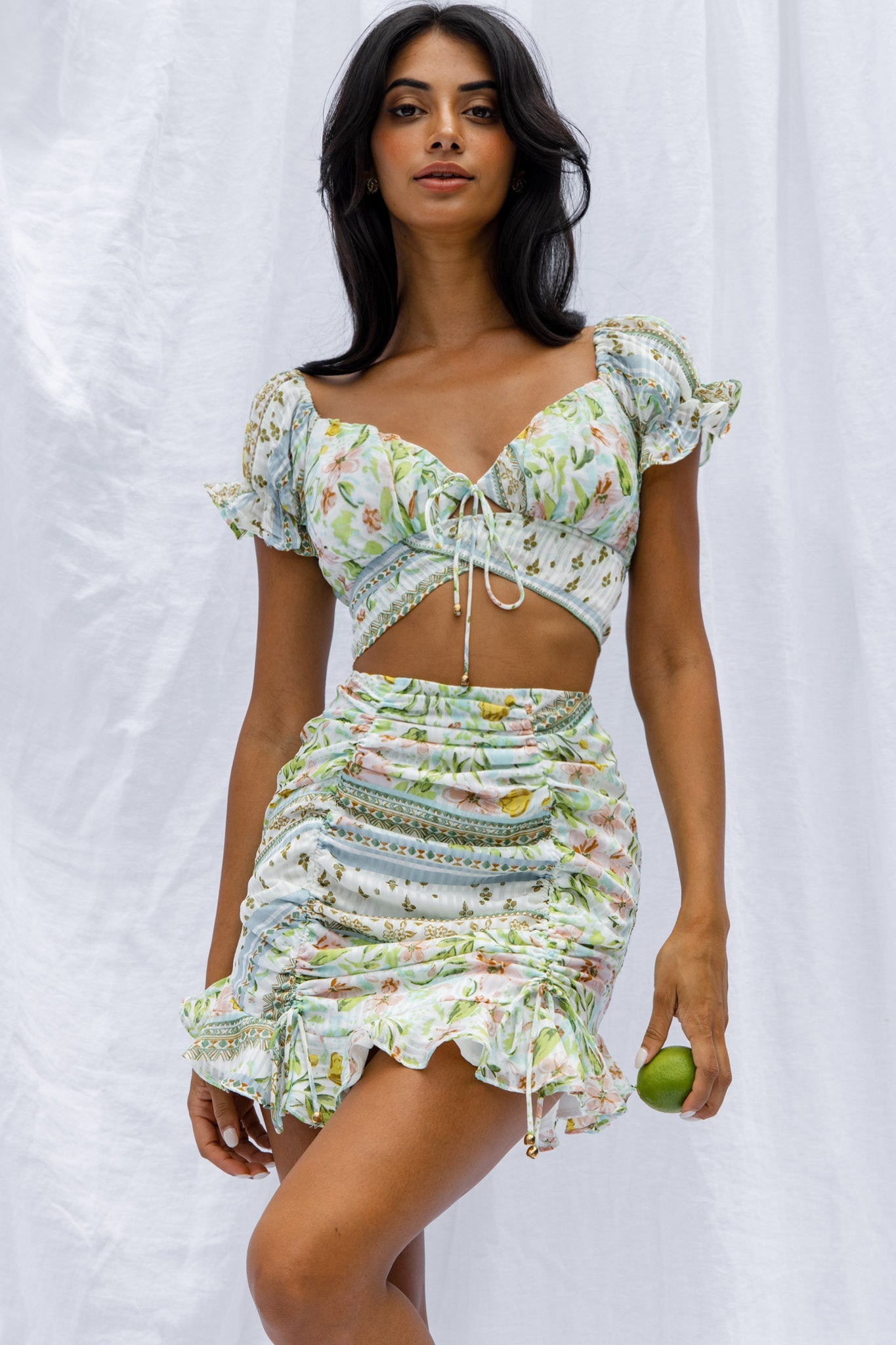 Our Azure Sky skirt is a major showstopper. Featuring drawstring ruching detail and a frill hem. It's perfect for a sunny Spring day, brunching with your besties. Team it with its matching crop top for an It Girl look that'll send you straight to the best-dressed list.