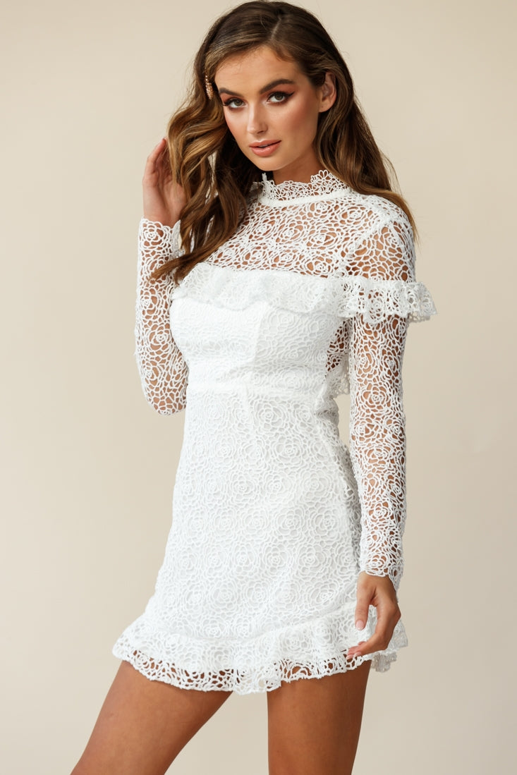 Make an entrance in our gorgeous Banks dress. Partially lined, it features a high neck, exposed back, frill detail aroud the arms and bust and pretty floral lace overlay. Perfect for a bridal shower or special occasion teamed with clear perspex mules and a clutch.