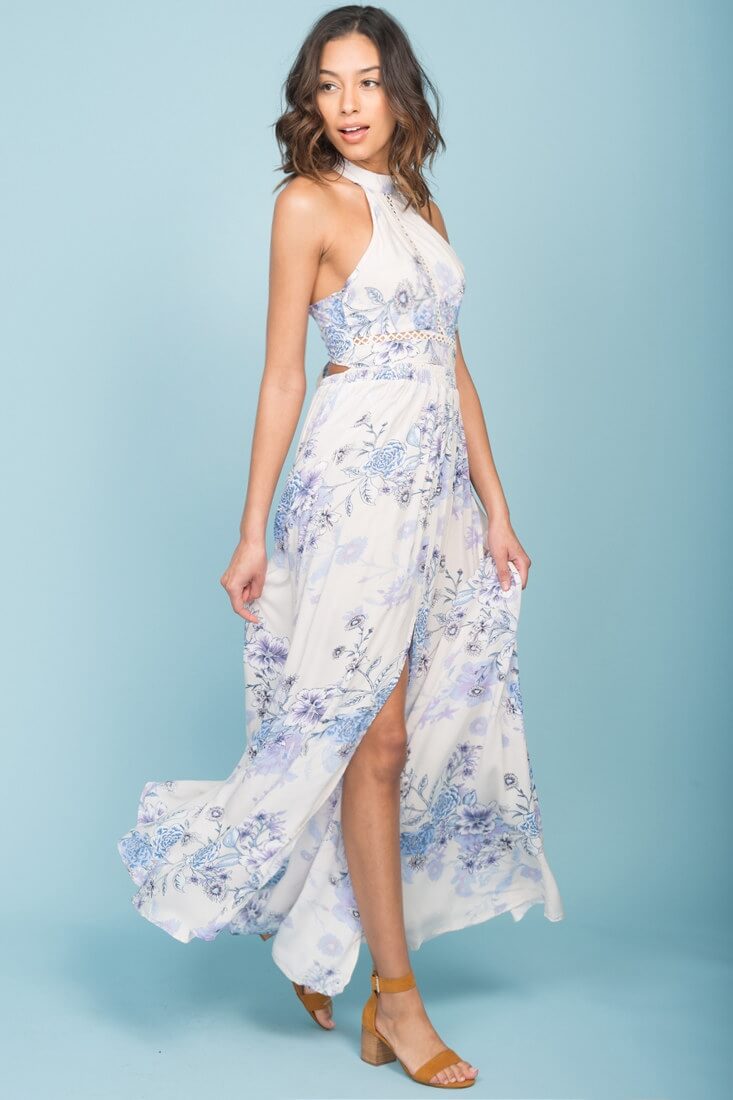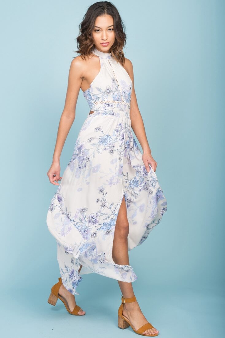 Formal or fun! Harmonious halter neckline with keyhole slit at bust. Pair with comfy flats and a denim jacket to fight the breeze.
