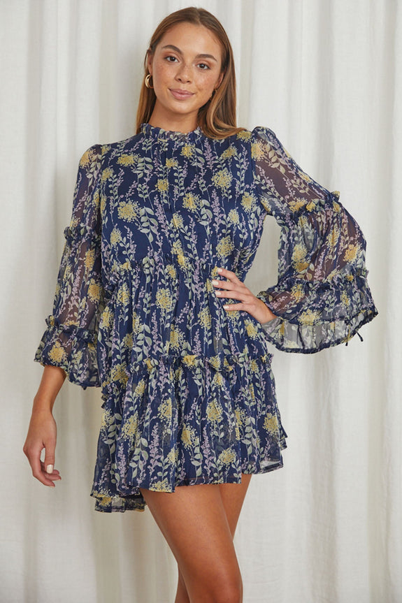 Beatrix High Neck Balloon Sleeve Dress Floral Midnight Blue