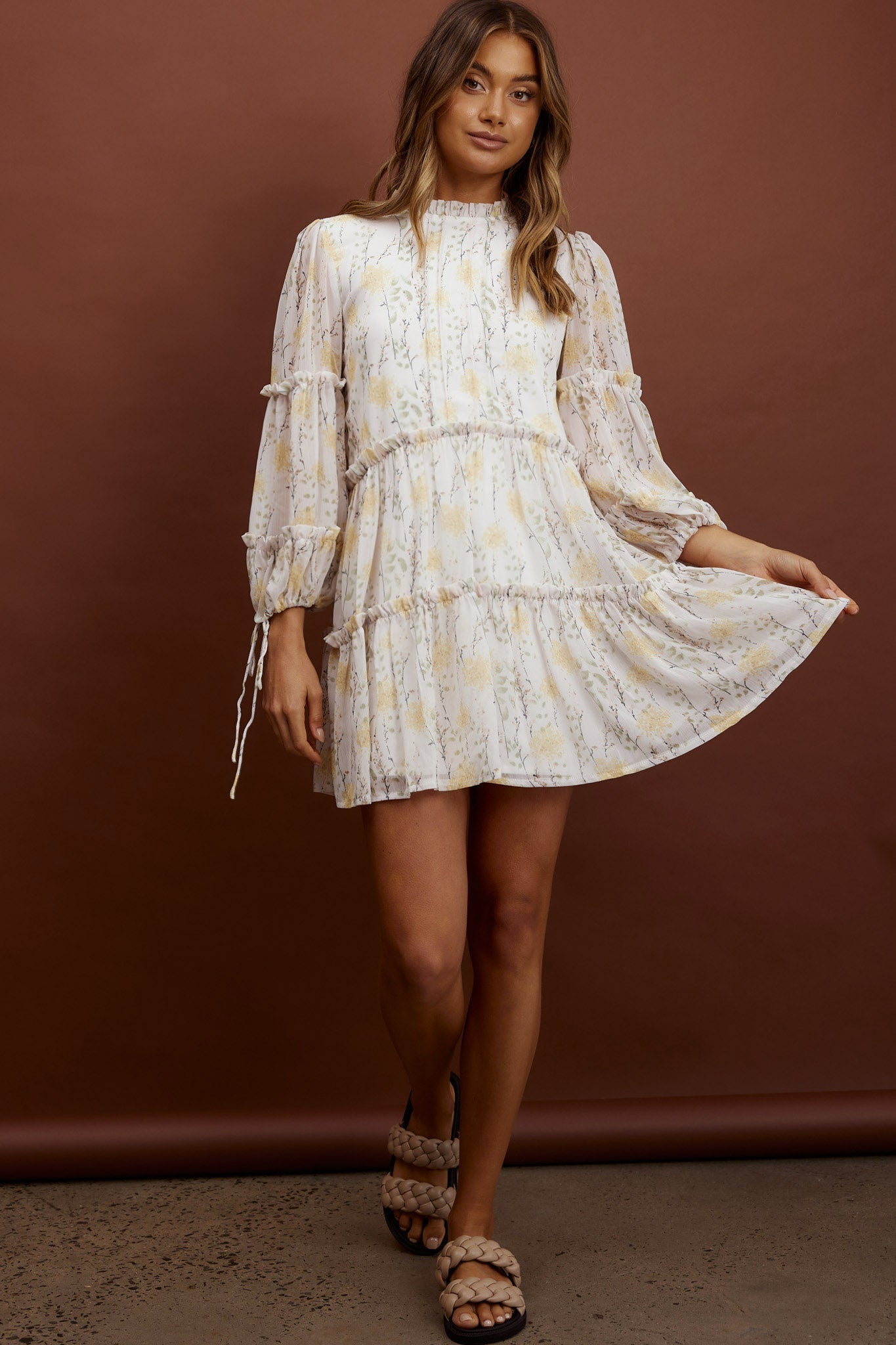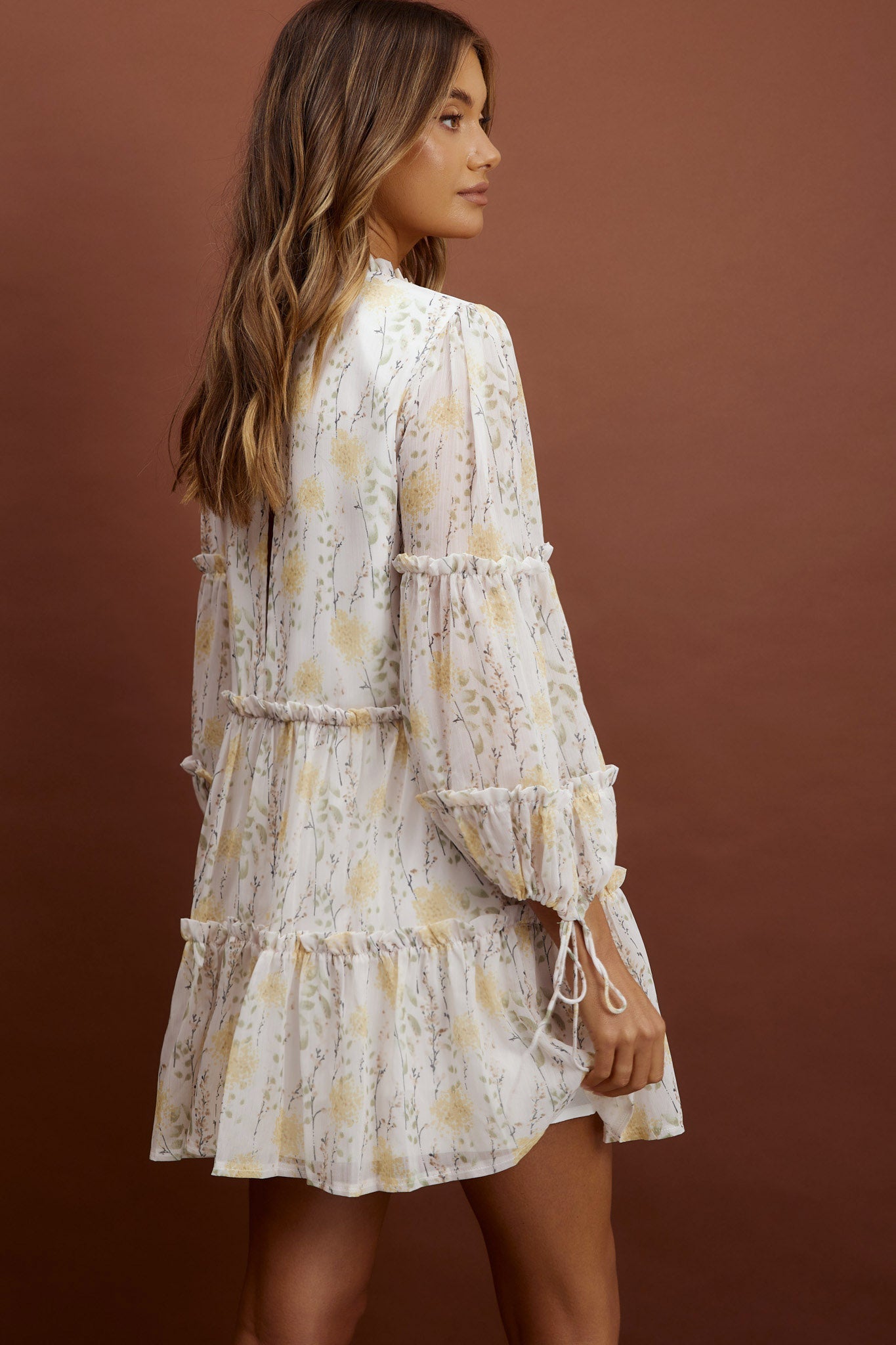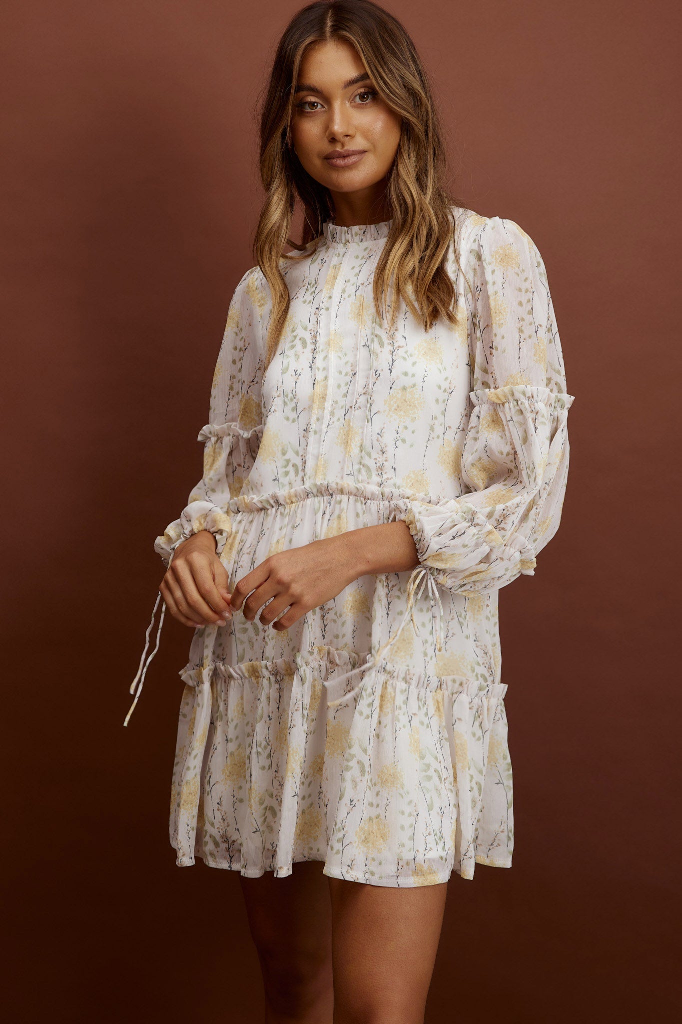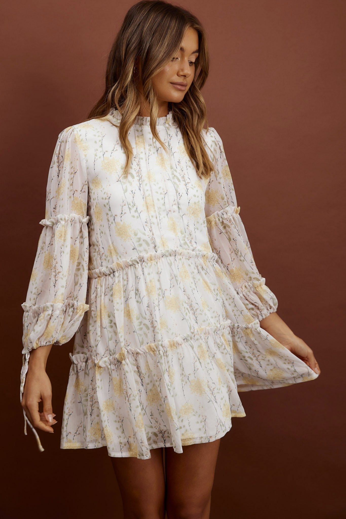 Beatrix High Neck Balloon Sleeve Dress Floral Yellow