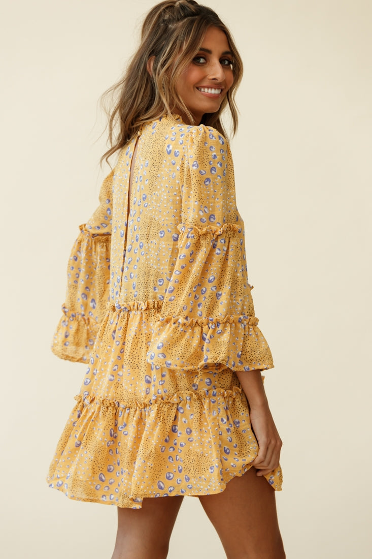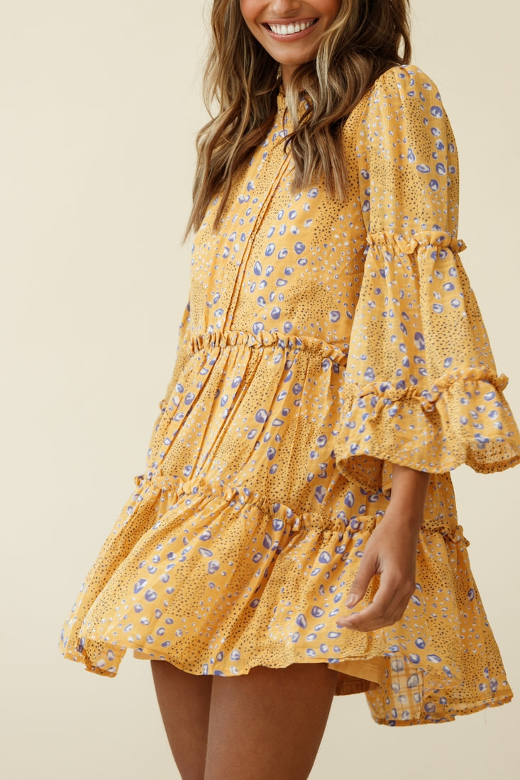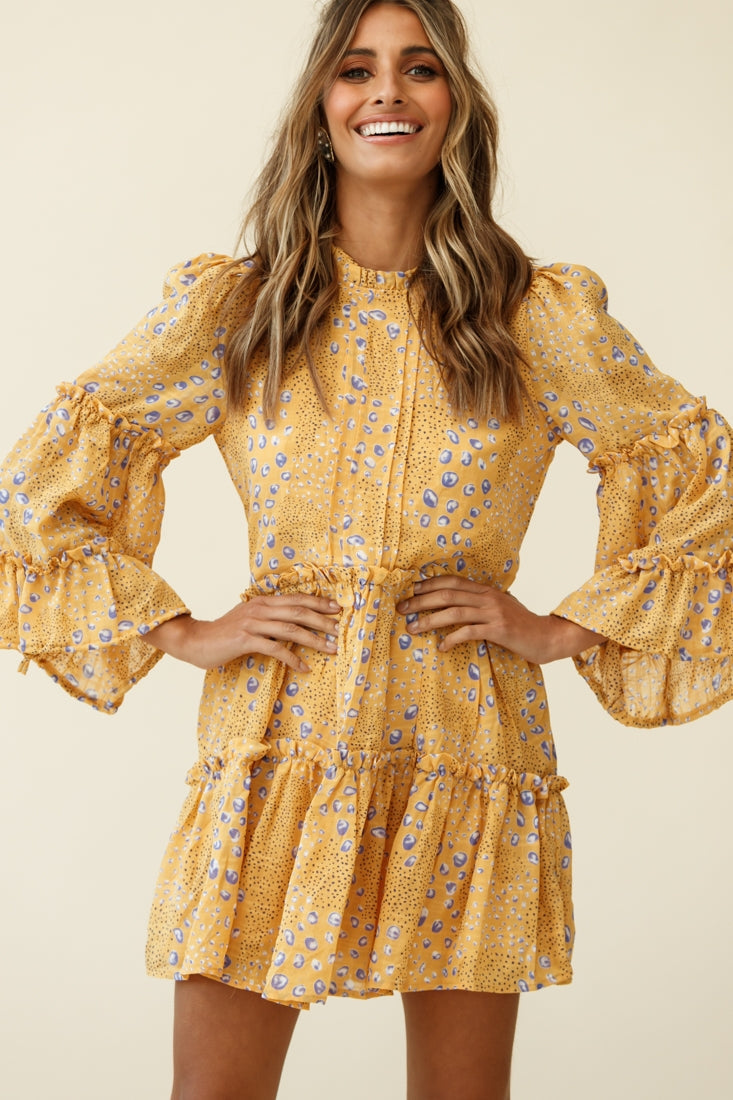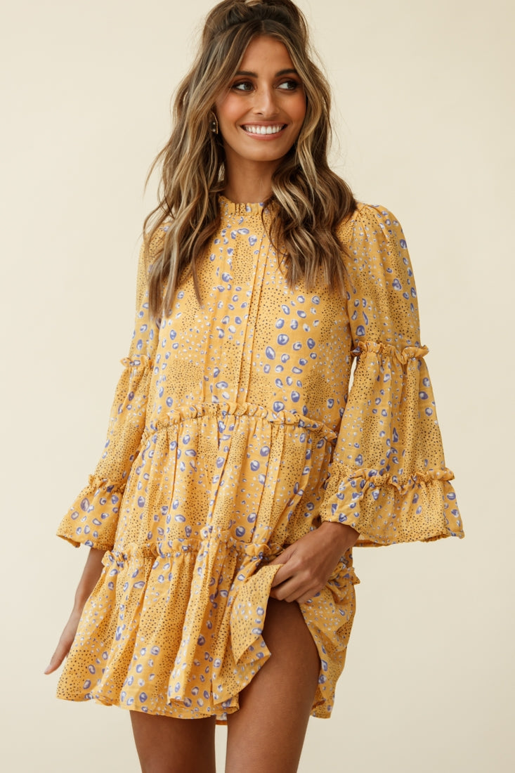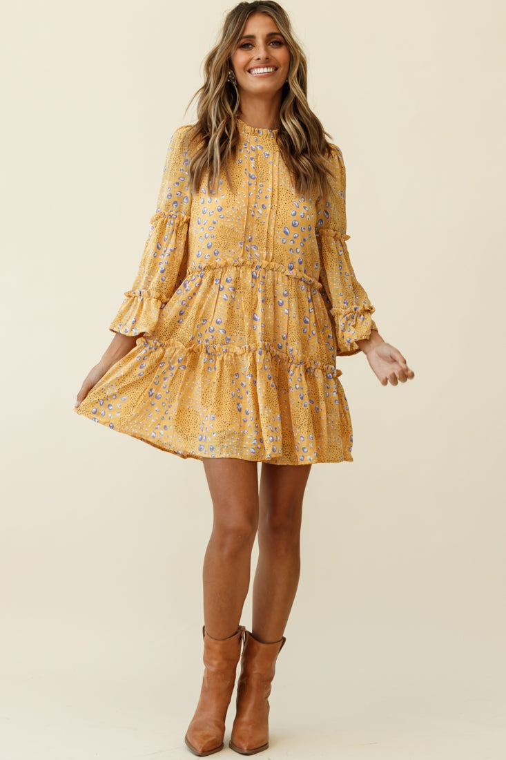 We are obsessed with our adorable Beatrix dress. Perfect for a mall day with your besties, it features a high neck, loose, shift style, three-quarter bell sleeves and pintuck details. Team it with some tan cowboy boots for a look we can't get enough of.