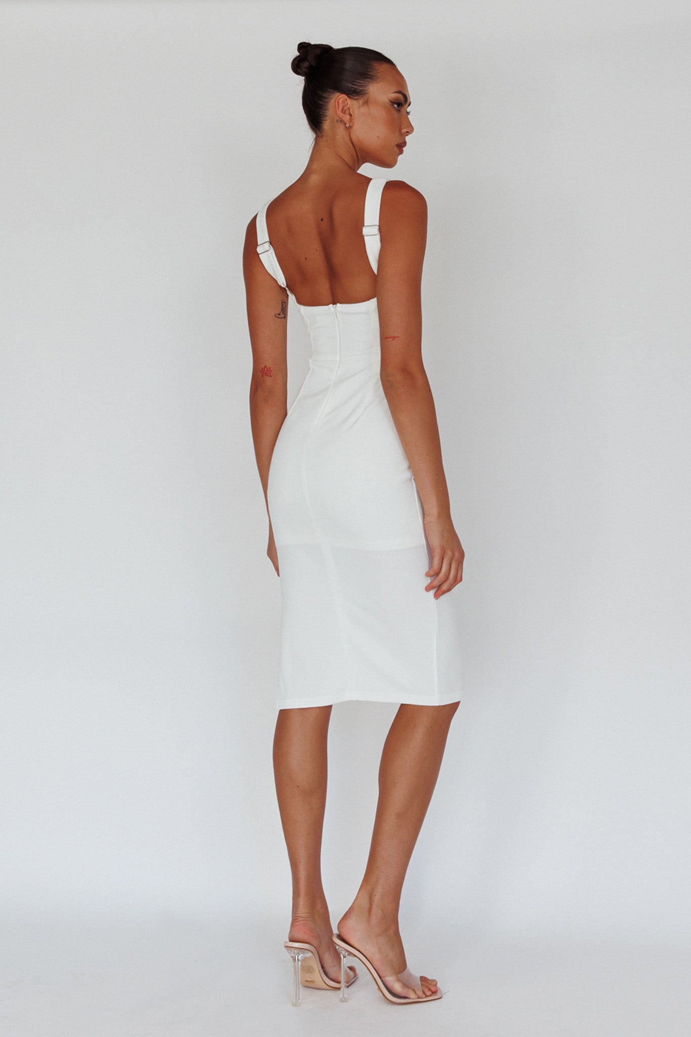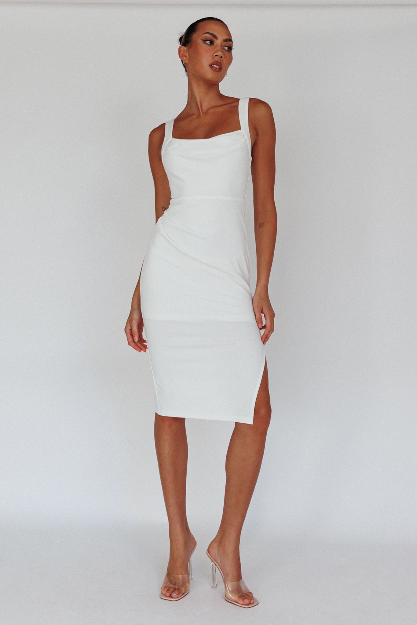 Every head will turn when you walk by in our stunning Bella Vista knee length dress. You KNOW we are obsessed with that chic silhouette and cowl neckline. This dress is made for a glitzy bachelorette night or vacay dinner dates with your love. Team it with strappy, white heels and a small white purse for the ultimate It Girl look.