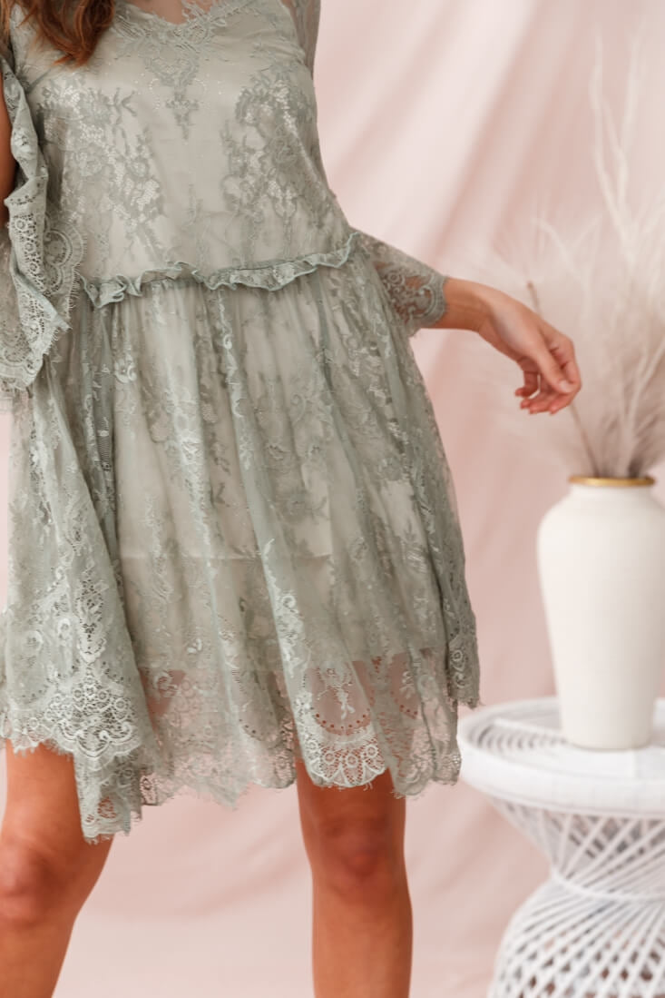 You are one pretty birdie in this vintage-look lace dress. Featuring a swing style and dropped waist, you'll fall in love with the feminine, floaty lace, scalloped hemline and gorgeous three-quarter bell sleeves. With a silky, spaghetti strap mini dress underlay and button closure at the back, our Birdie dress will have you wanting to prance through a rose garden, sipping peppermint tea. Team it with delicate jewelry and fresh flowers in your hair, dahling!