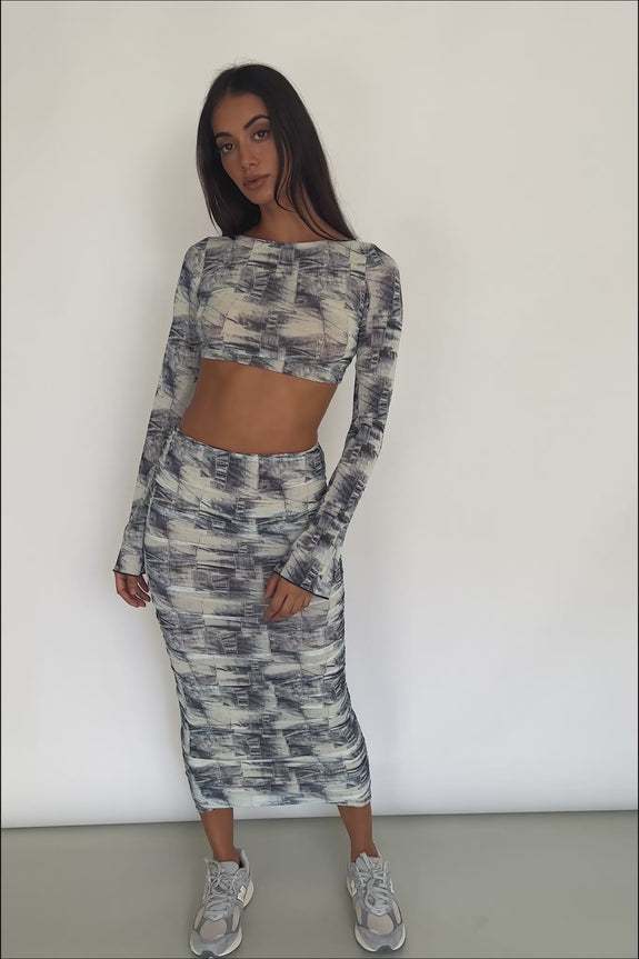 You will stop traffic in our super hot Blue Moons crop top. We are in love with its trendy print and double strap feature in the back. Perfect for Friday night at your fave rooftop teamed with its matching midi skirt and boots.
