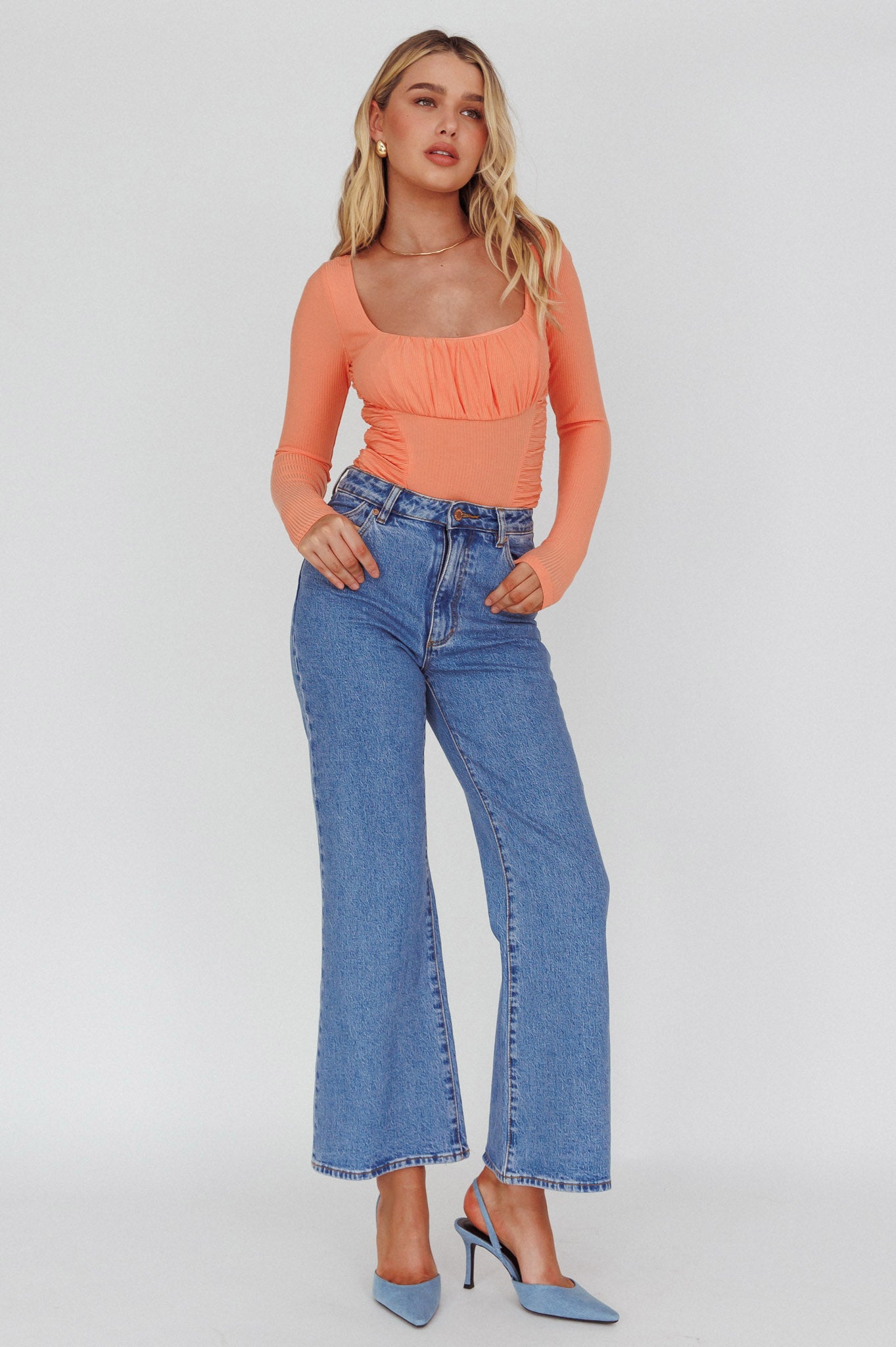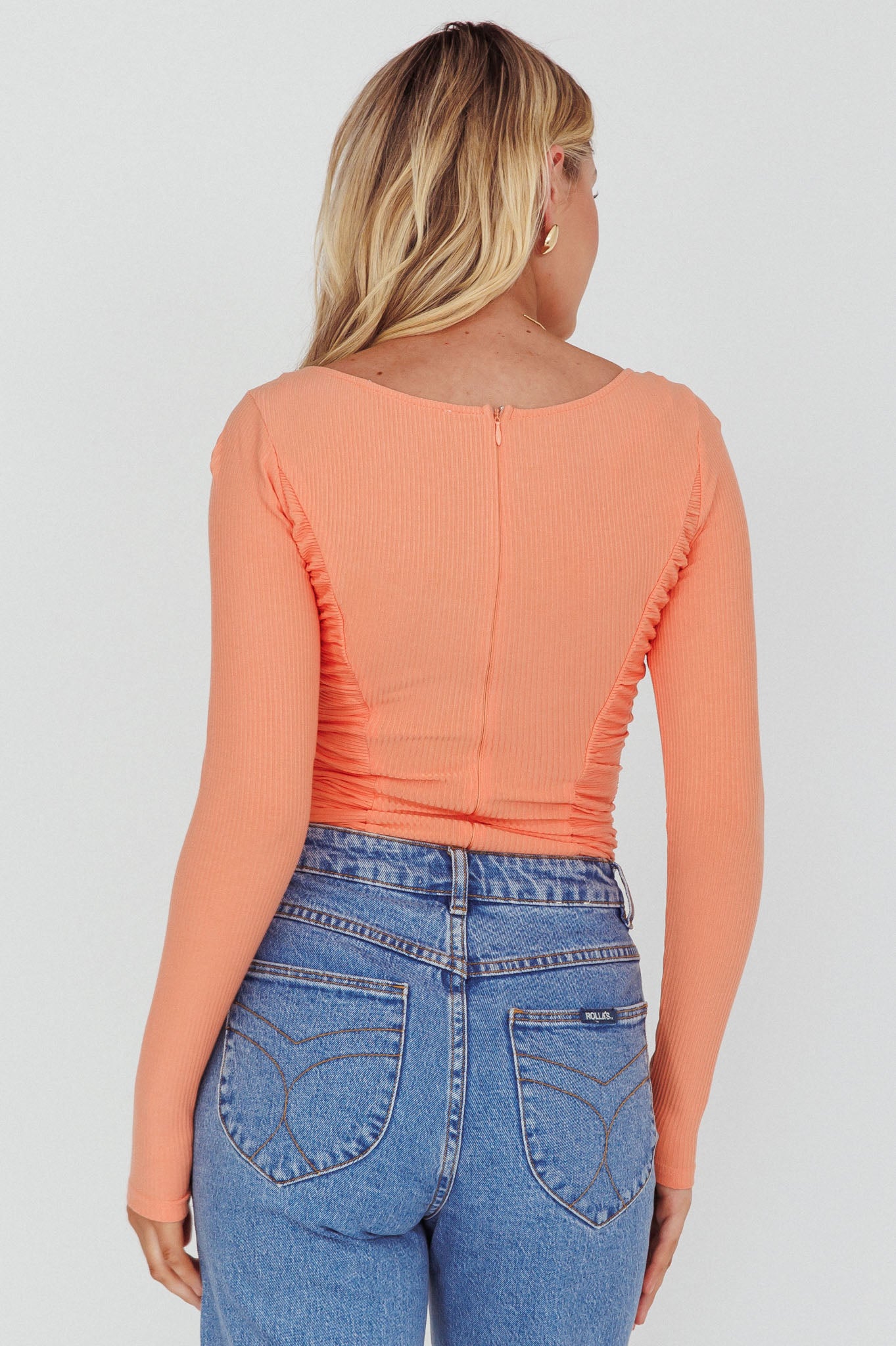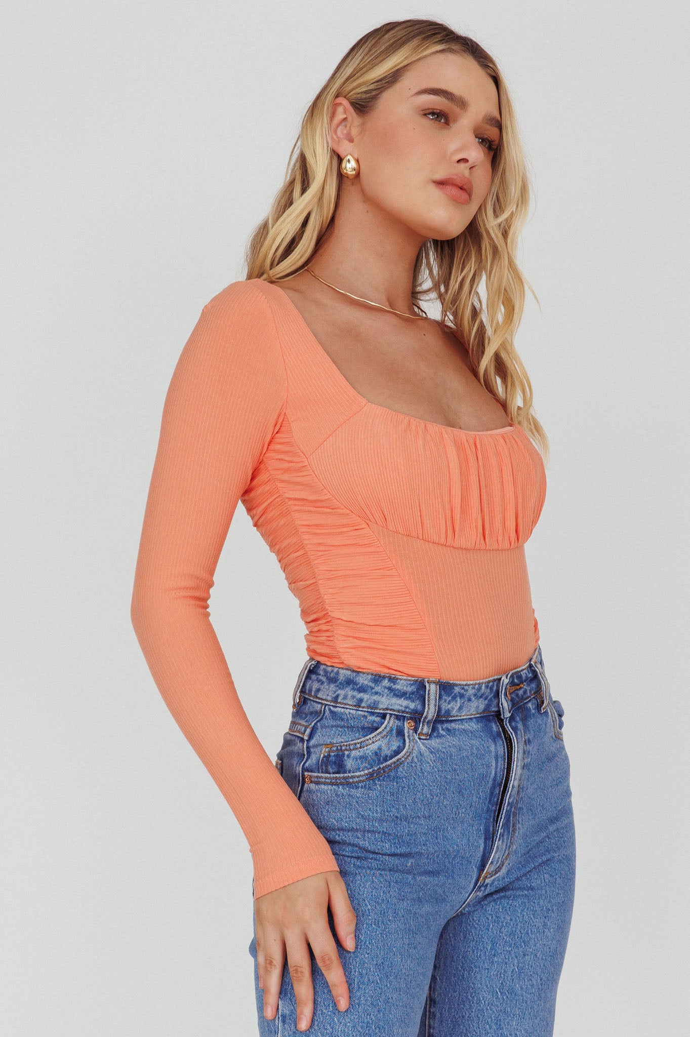 Bobbi Long Sleeve Ruched Side Ribbed Bodysuit Orange