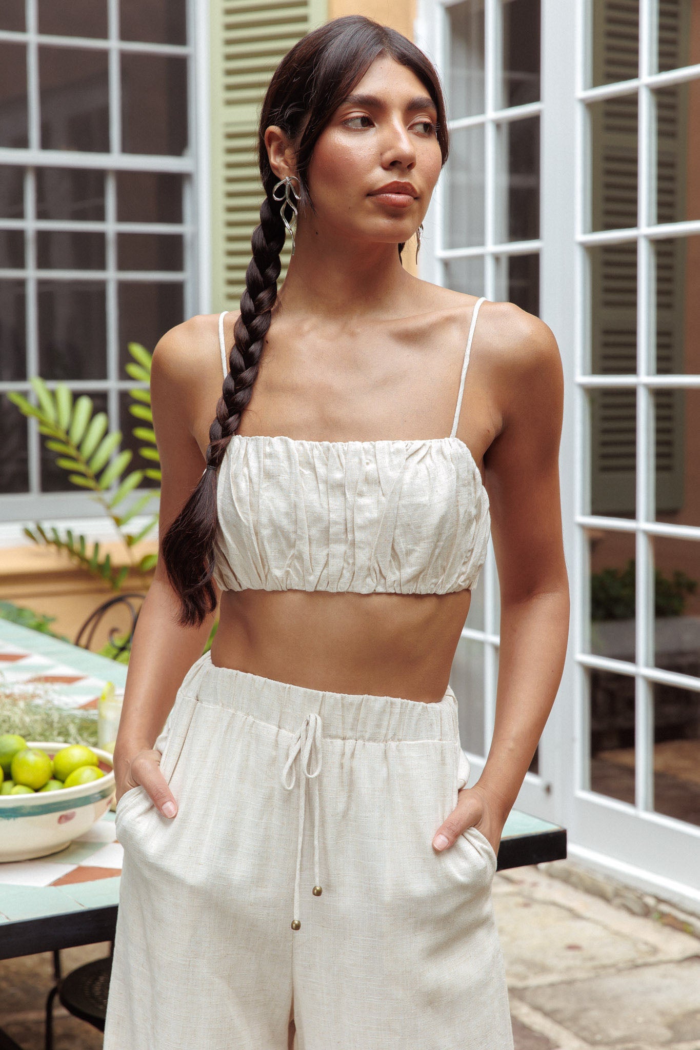 You'll feel like packing your bags and escaping for the weekend in our pretty Bondi crop top. It features gathering detail and a zipper in back. It's perfect for warm weekends at your fave lunch spot or strolling the beachside markets. Team it with its matching pants and a straw tote to complete the look.