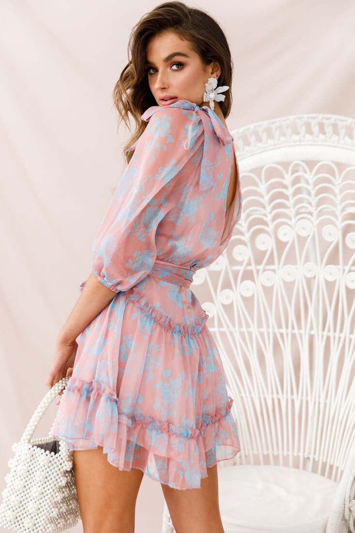 Wedding? Cocktail party? This dress has you covered. With its on-trend ruffle hemline, three-quarter balloon sleeves and flattering, faux-wrap neckline, everyone will be asking, girl, where'd you get that dress?! We are loving the adorable bow details on the shoulders! Pair it with single strap nude heels to complete the look.