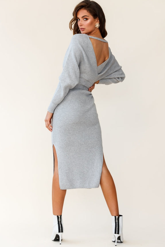Snag yourself a cutie in our cozy but sexy Cameo dress. Featuring soft, knit fabric, long batwing sleeves, flattering crossover neckline and belted waist tie. We are loving the midi length with splits on either side. Perfect for snuggling up by the fire with a glass of wine, post romantic dinner date. Team it with boots and a beret for a cozy look we are loving.
