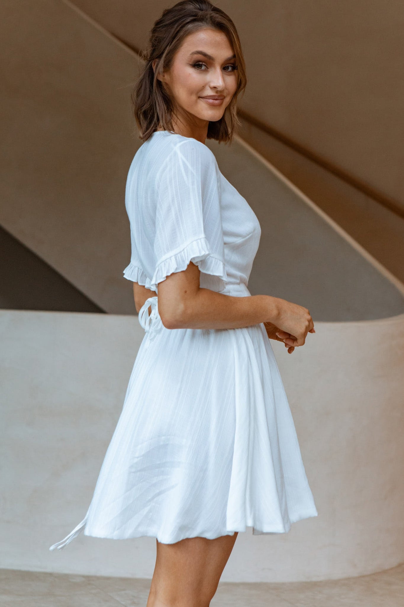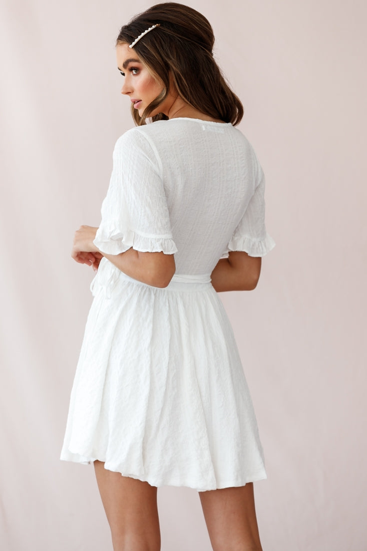 Turn heads in our super cute Cara dress. Partially lined, it features a wrap style that ties at the waist, frill-trimmed sleeves and an asymmetrical hemline. Perfect for work or play teamed with mules and a tote.