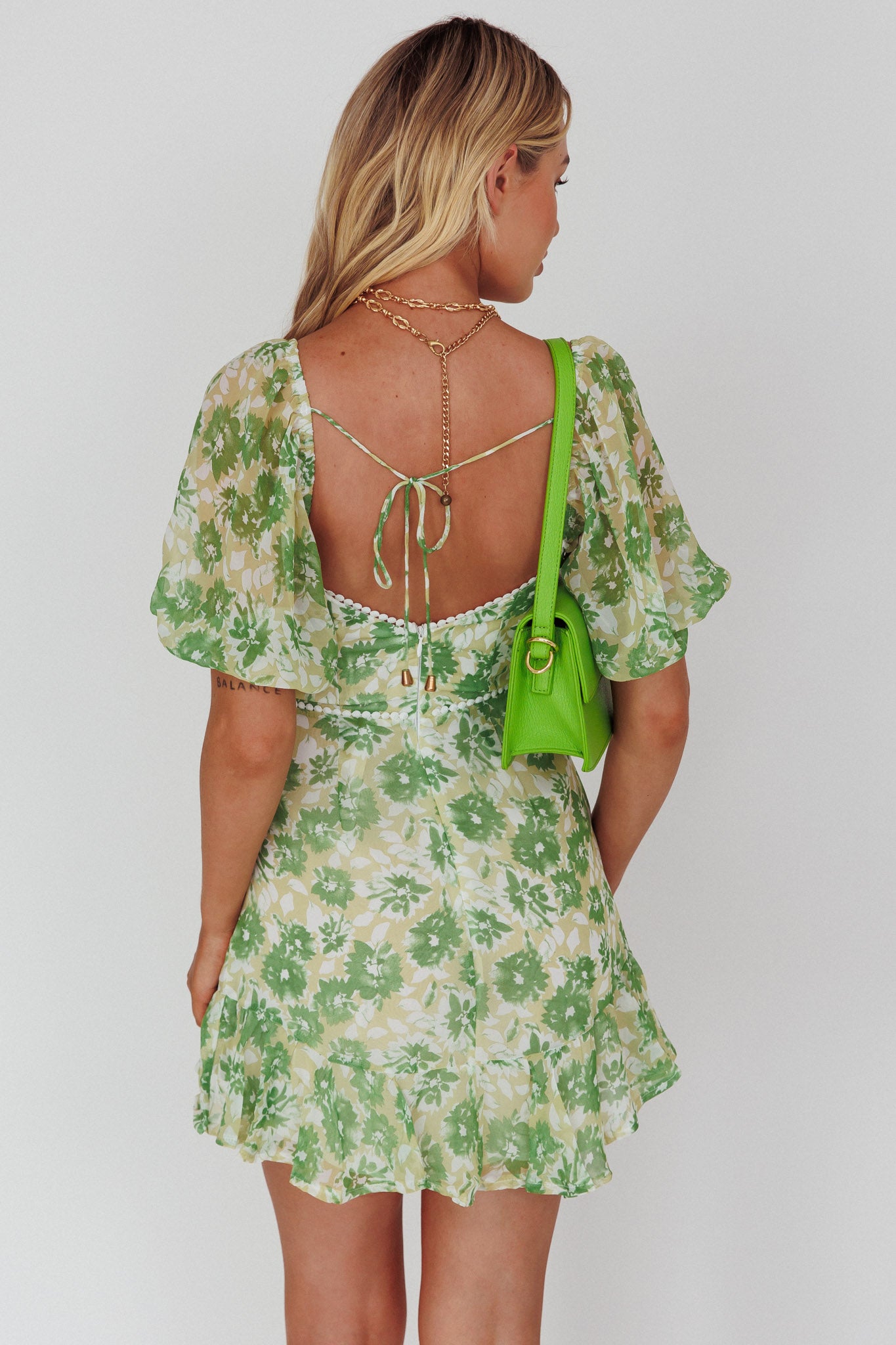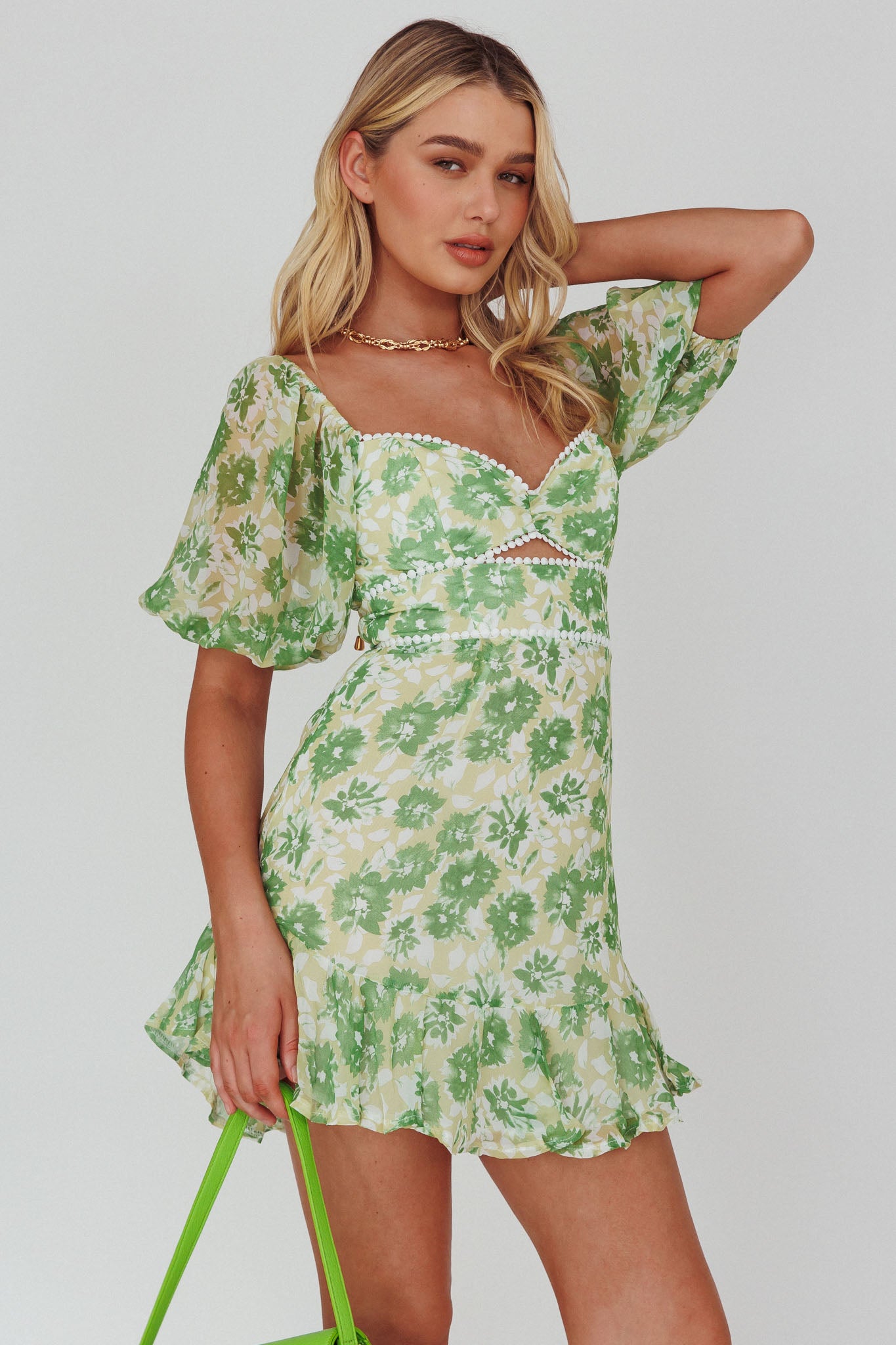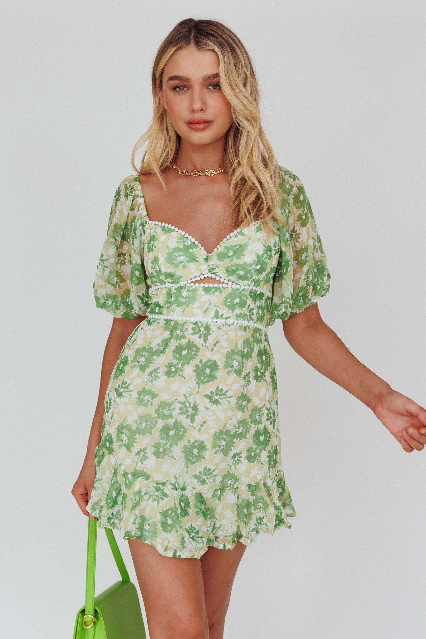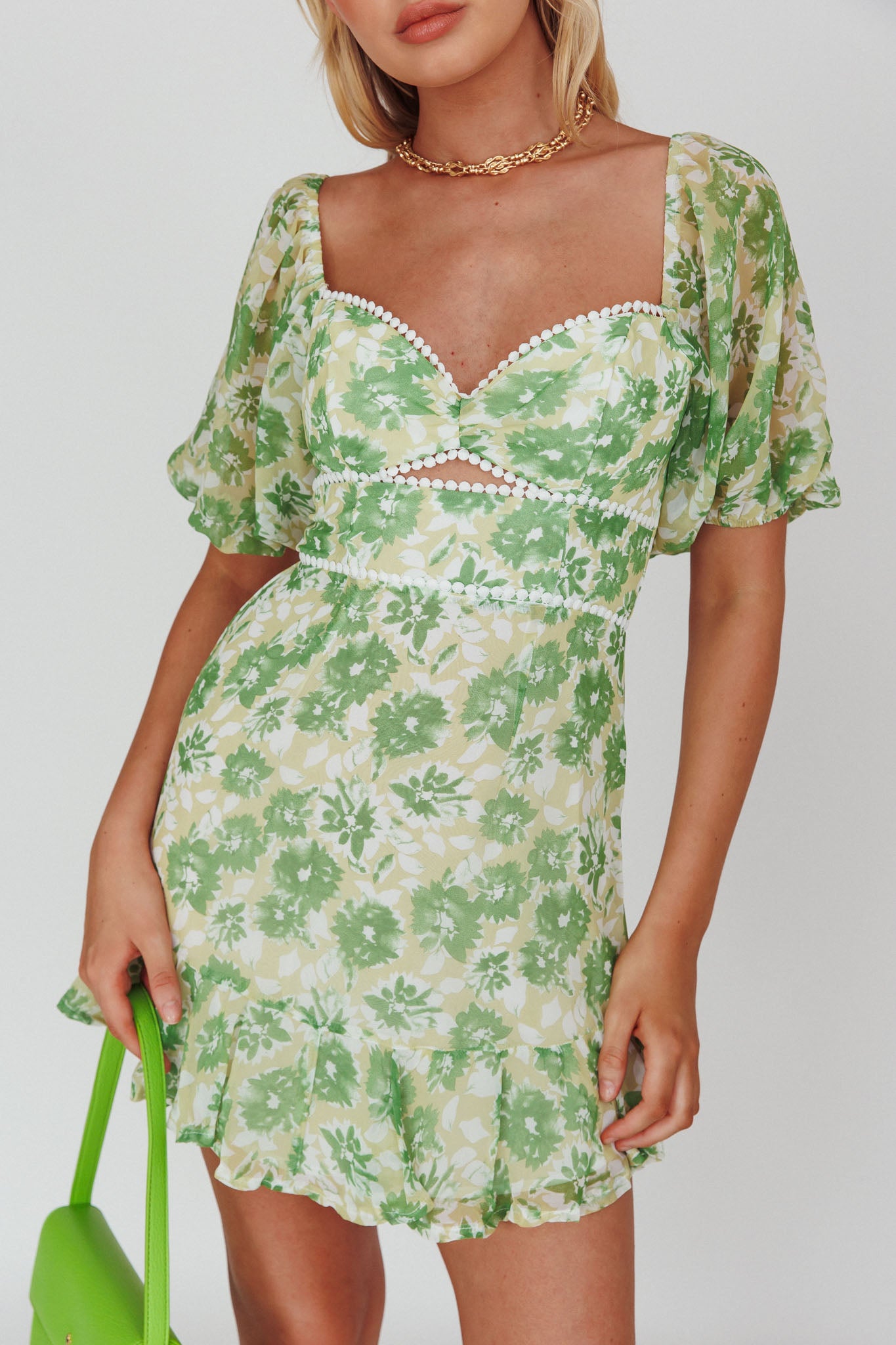 - Green floral print dress