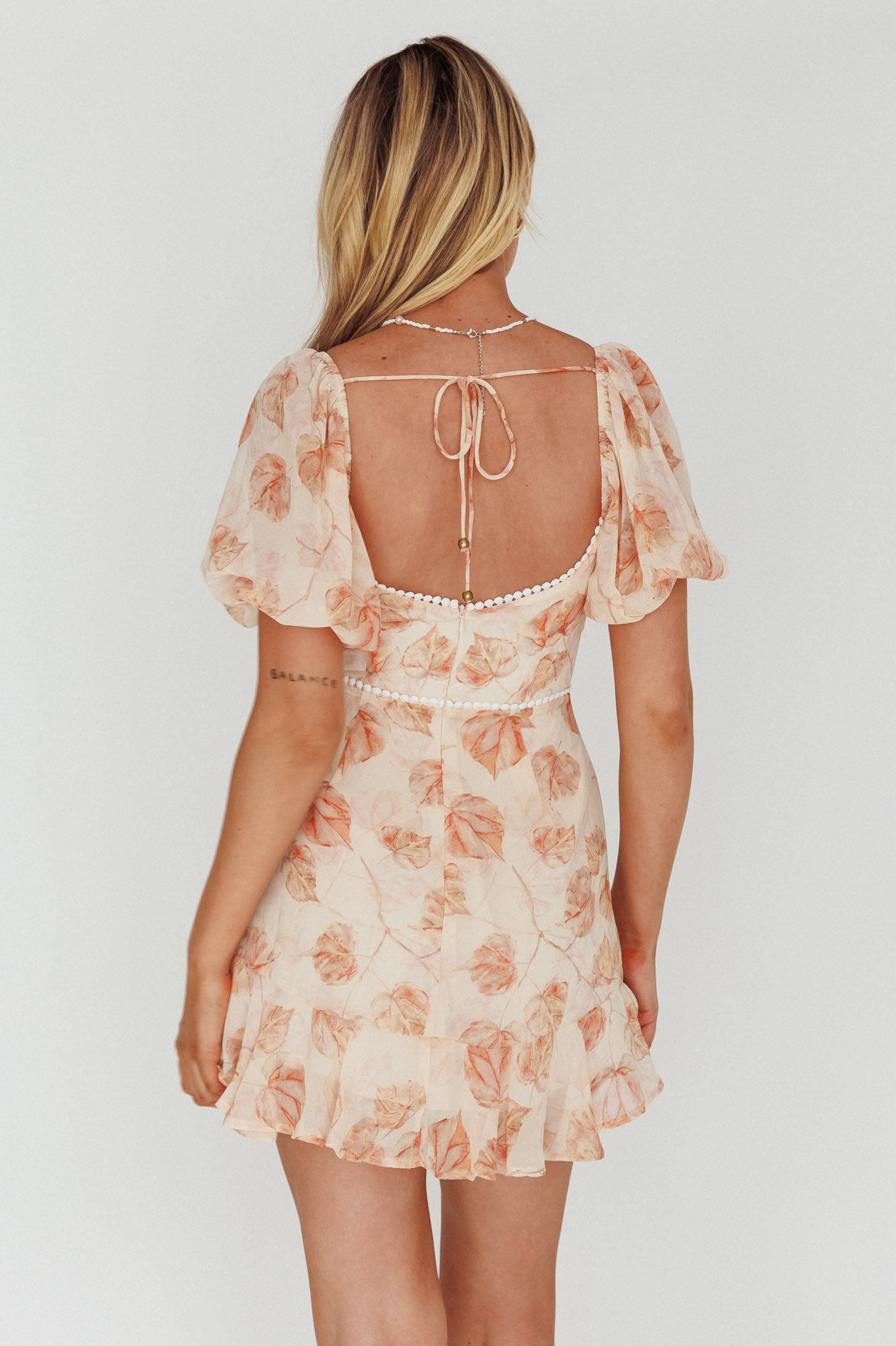 Catch Feelings Sweetheart Puff Sleeve Mini Dress Leaves Beige