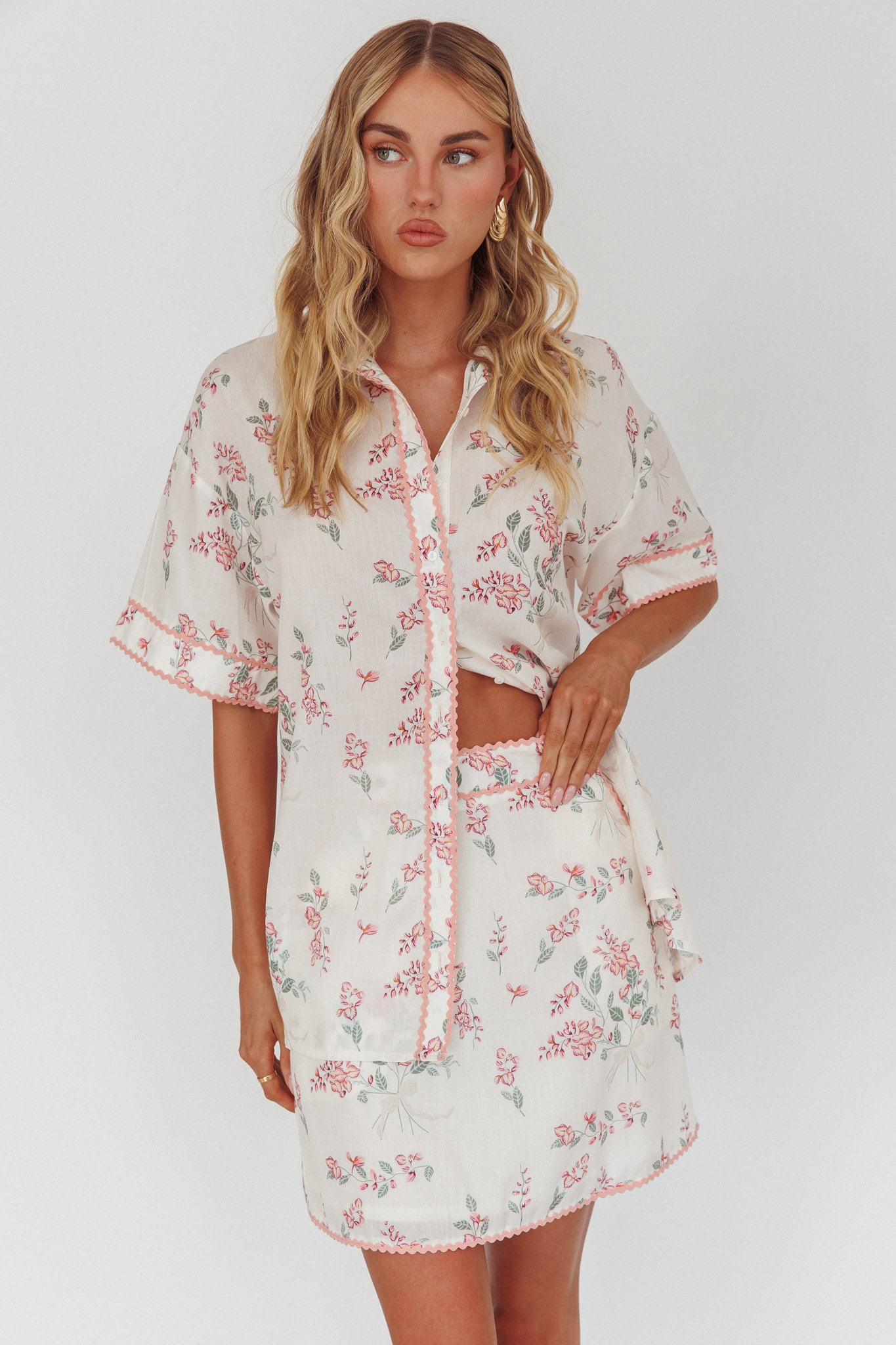 Make an entrance in our pretty Catherina mini skirt. It features a feminine floral print and ric-rac trim and is just what you need for a picnic date with your besties. Team it with its matching shirt and sandals for a dreamy look.