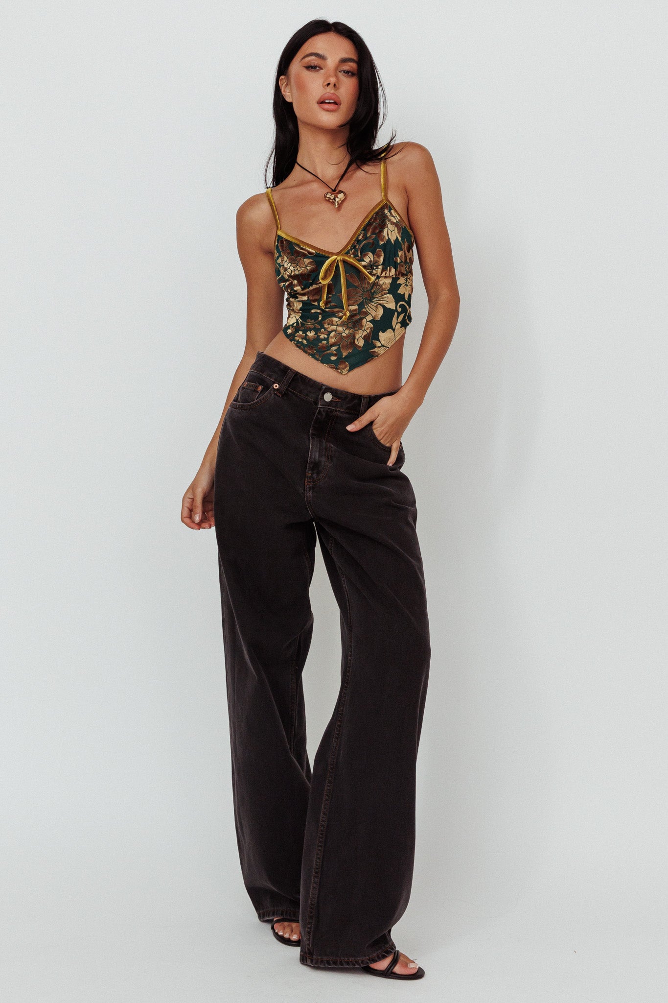 Caught Feelings Floral Velour Crop Top Green/Gold