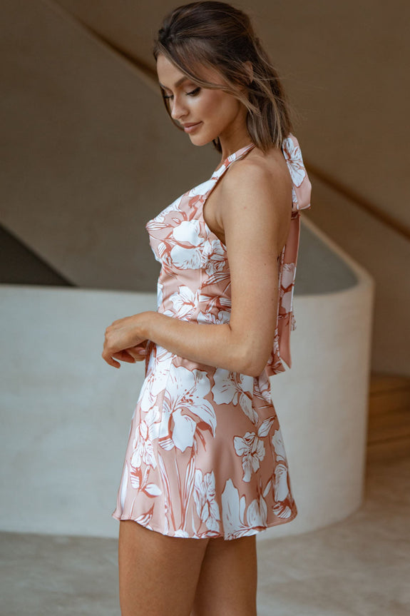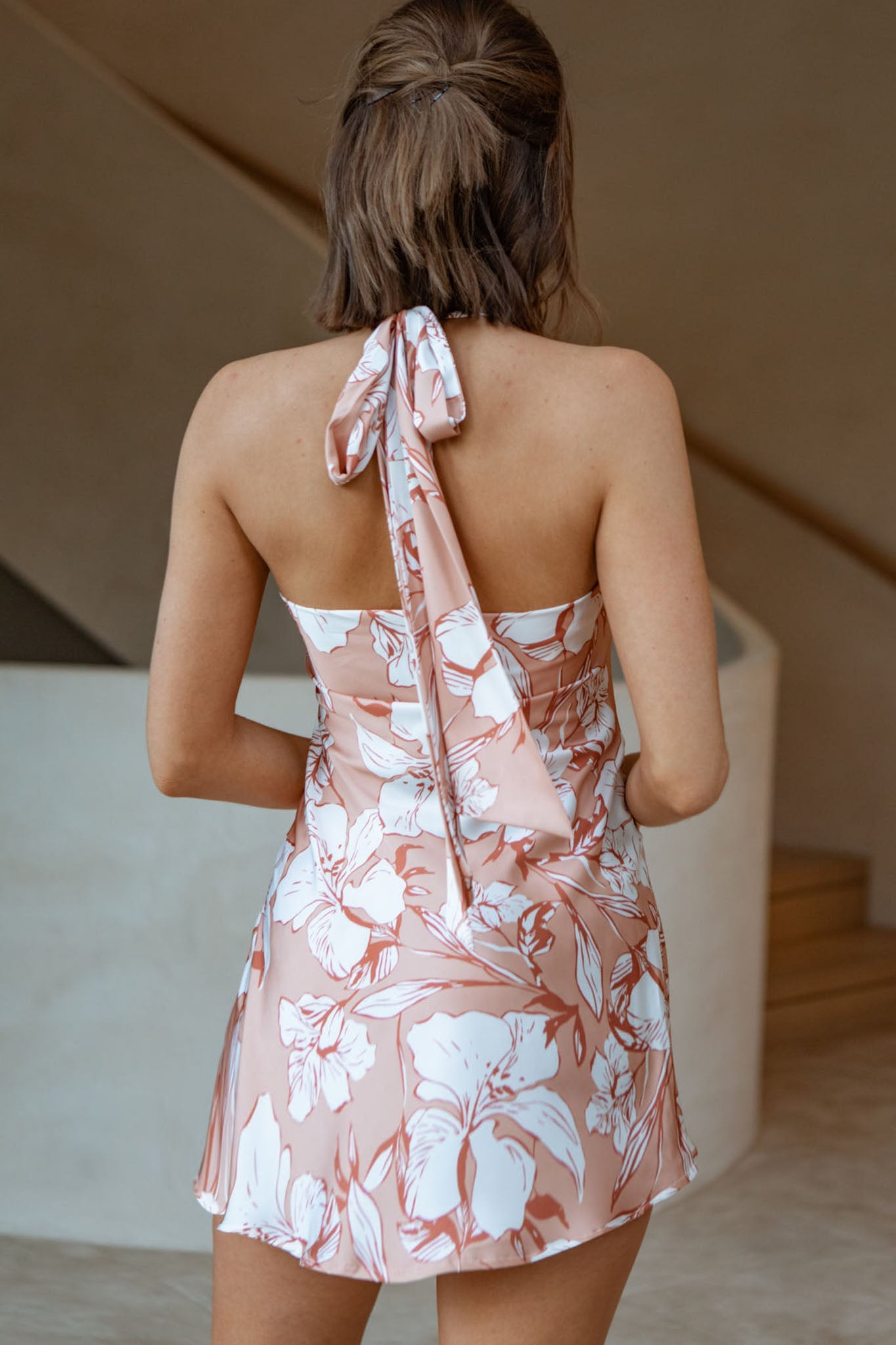 Champagne Showers Halterneck Slip Mini Dress Hibiscus Print Peach