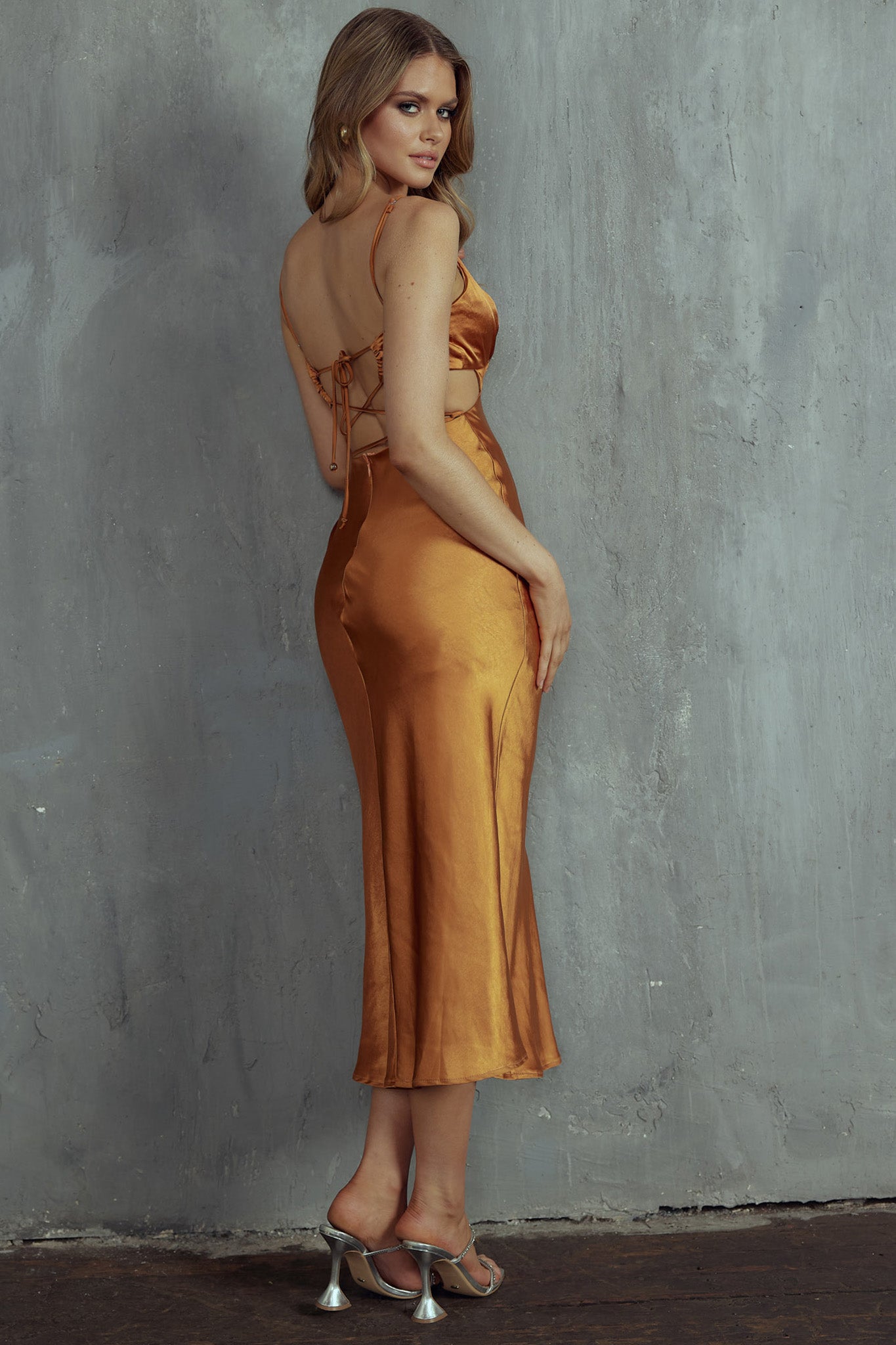 Turn heads in our gorgeous City Lights dress. Featuring a strappy back and satin fabric, it's perfect for date night with your lover. Team it with perspex mules and a clutch for an elegant look.