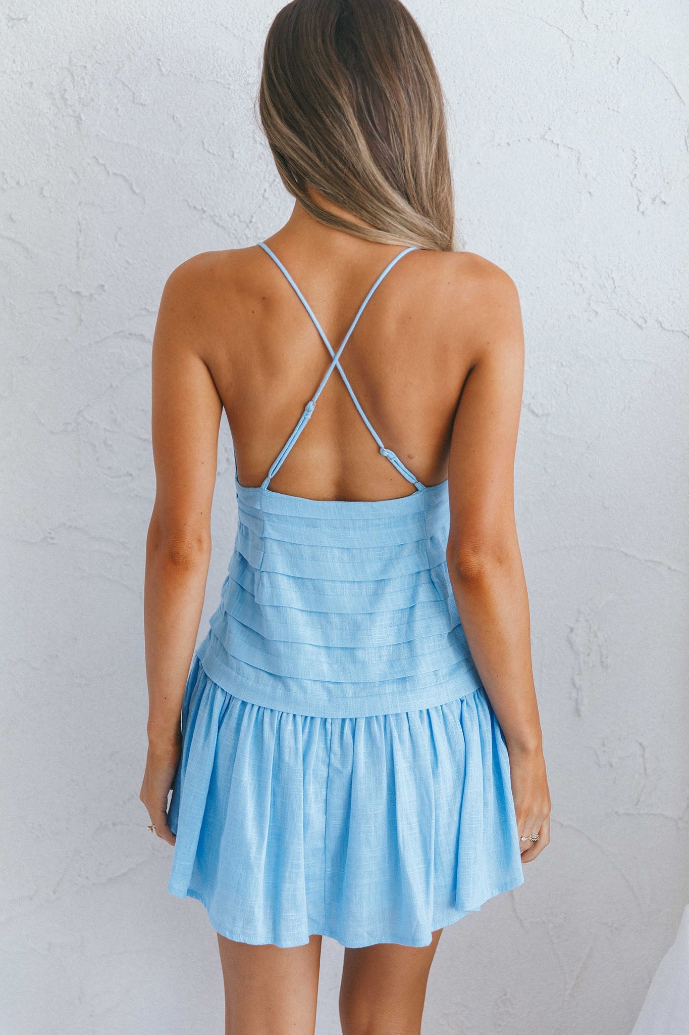 Clear Skies Pintuck Pleat Wide Ruffle Hem Mini Dress Sky Blue