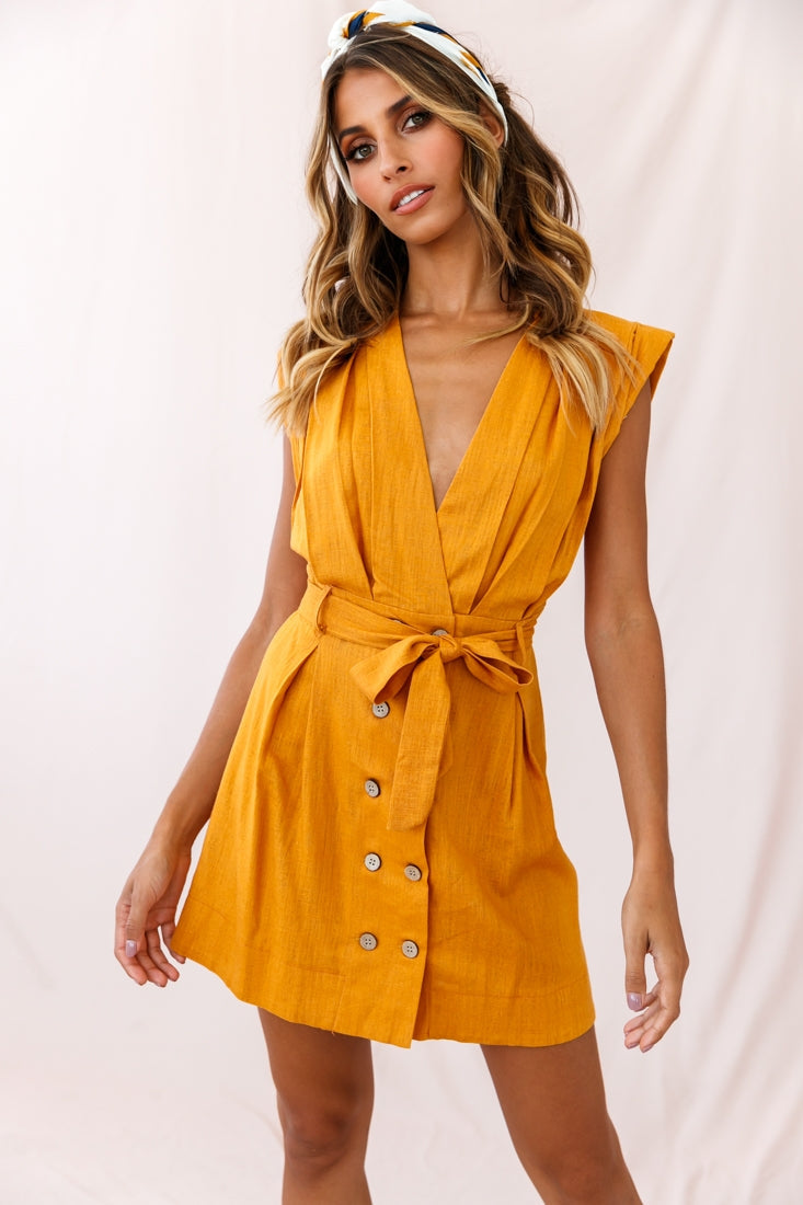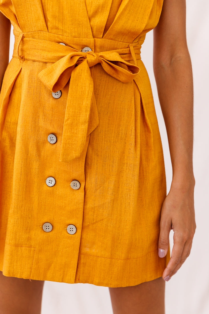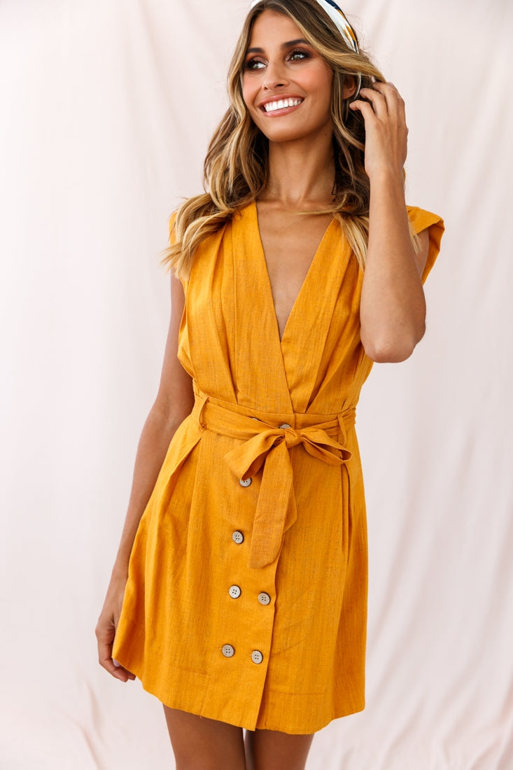 Make an entrance in our adorable Clementine dress. Featuring super cute, short, rolled sleeves, deep V-neckline, placket style skirt with wooden buttons, a separate belt and a unique key-hole, cut-out back. Team it with fresh white sneakers and a head scarf for a playful look we are loving.