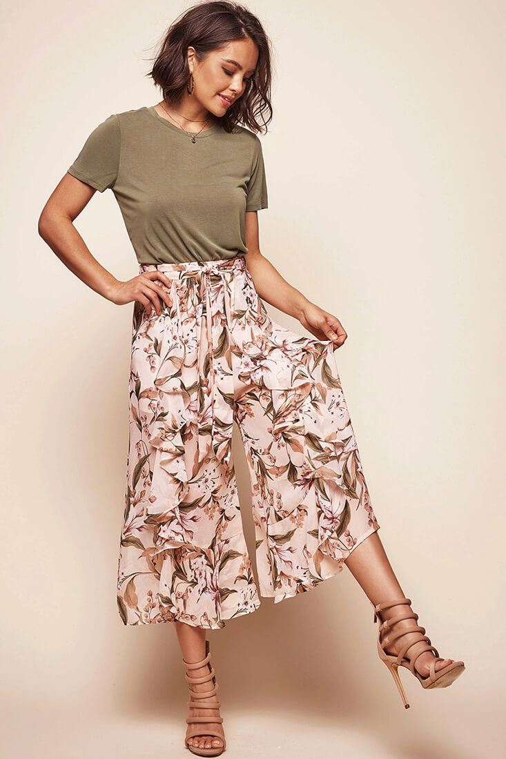 These on-trend wide leg pants are a summer essential. Featuring a wide ruffle down the front of each leg, and light, breezy fabric, these pants are the perfect cropped length and dreamy AF. Style them with a plain Tee, tucked in, for maximum Summer-chic vibes.