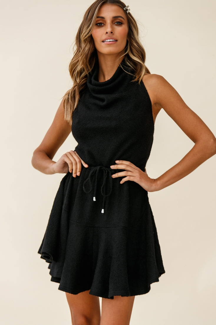 Slay those Fall days in our cute Cosette dress. Featuring a soft knit fabric throughout, high cowl halterneck style, drawstring around the waist and fluted hem. Perfect for a movie date with bae teamed with boots for a super cute look we are loving.