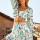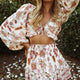 Costa Rica Tied Front Balloon Sleeve Crop Top Boho Floral Print Tan