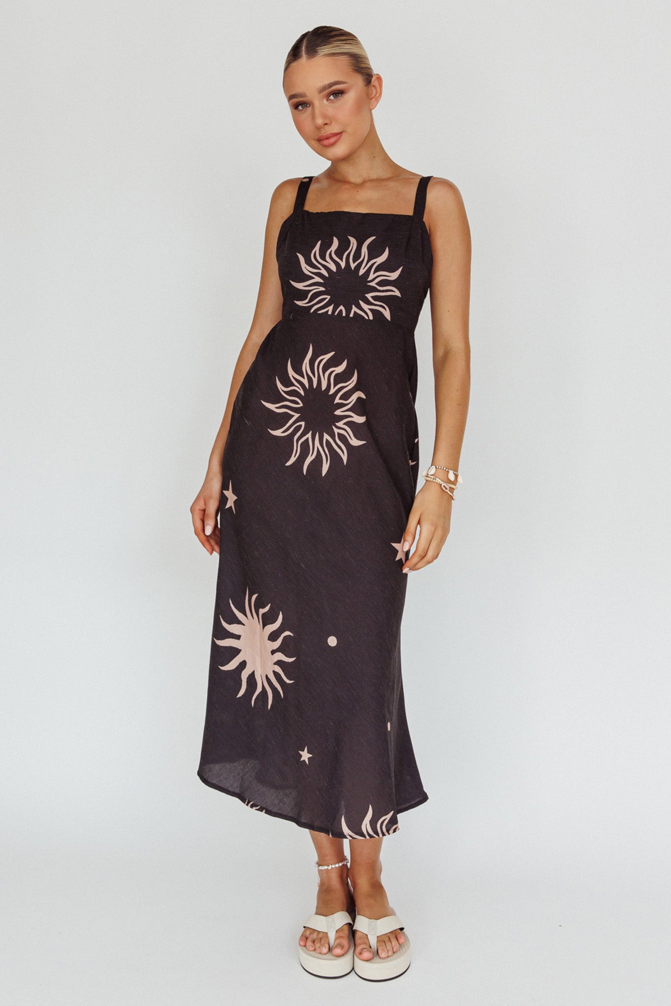 Say hello to our gorgeous Coucou midi dress. Featuring a breezy silhouette and cute celestial print. It's perfect for weekend coffee dates with your bff's. Team it with sandals and a straw tote for a look we are loving.