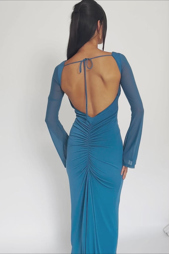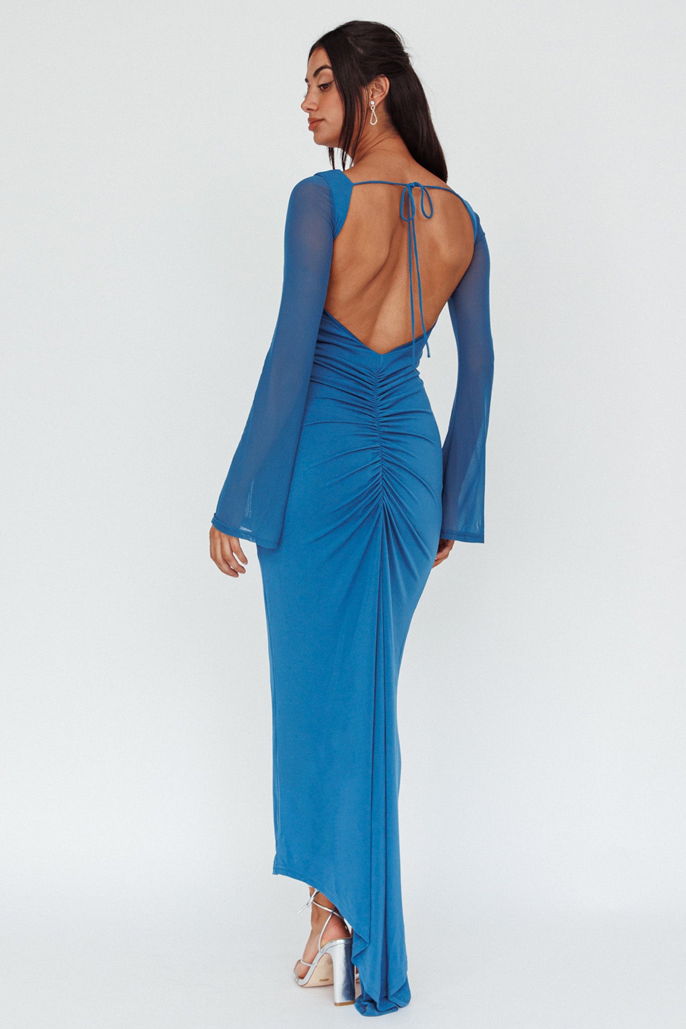 Crystal Ball Open Back Ruched Maxi Dress Blue