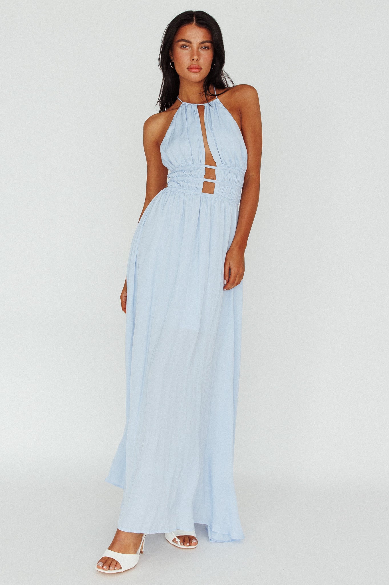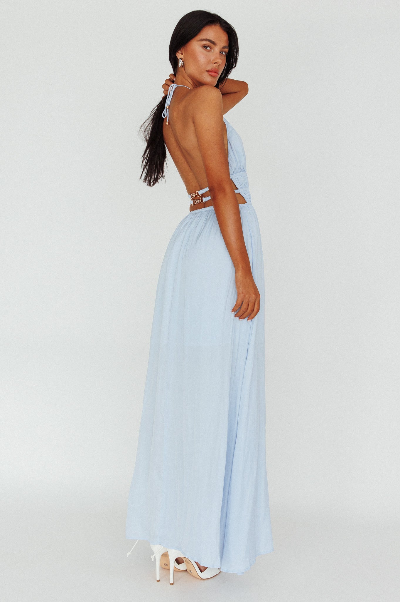 Steal the spotlight in our gorgeous Cyndi maxi dress. Featuring a cut-out bodice and open back with gold buckle detail. It's perfect for a birthday or special occasion. Team it with mules and a tote for a chic look we are all about.