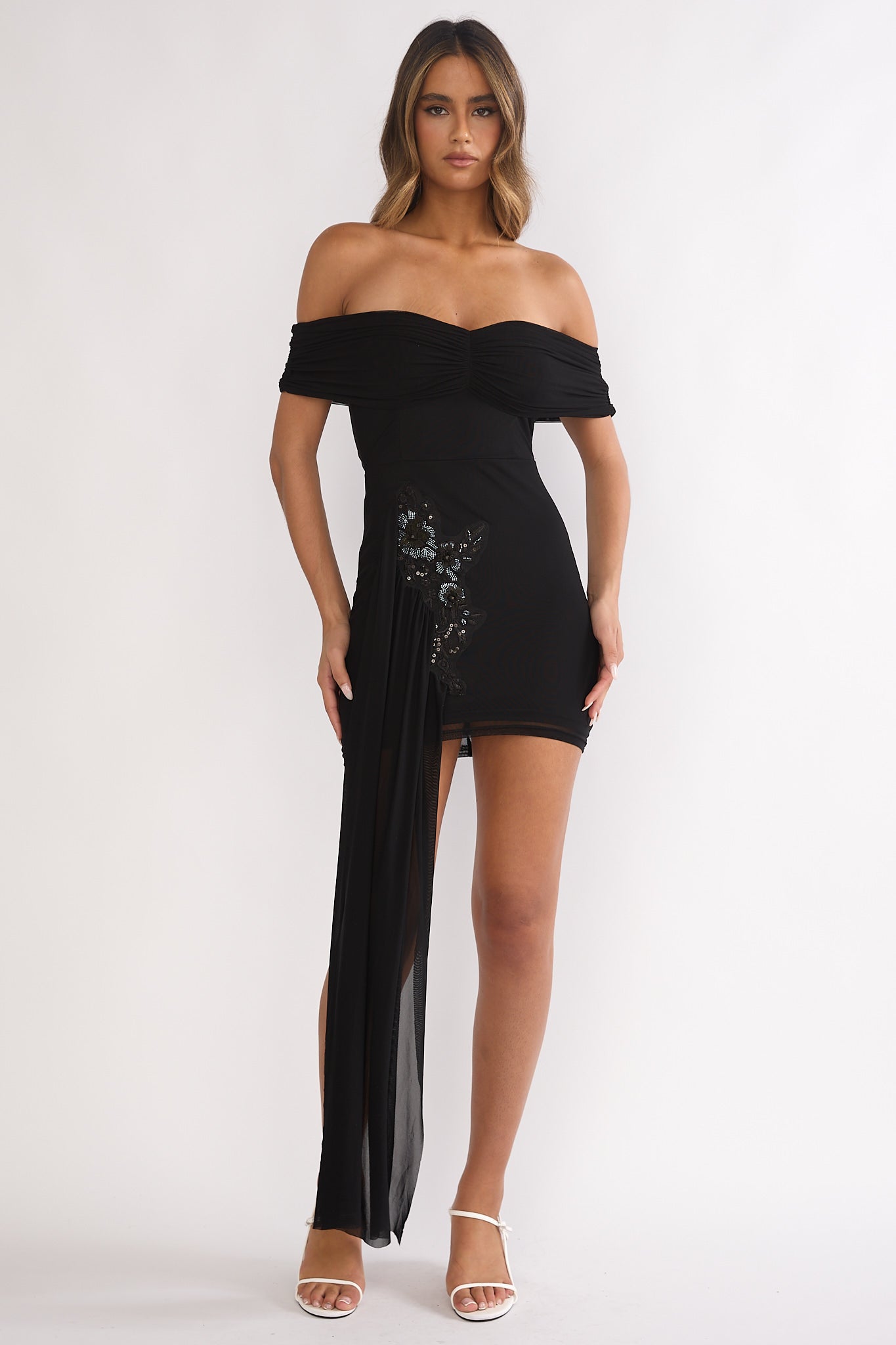 Dahlisse Off-Shoulder Sash Mini Dress Black