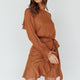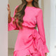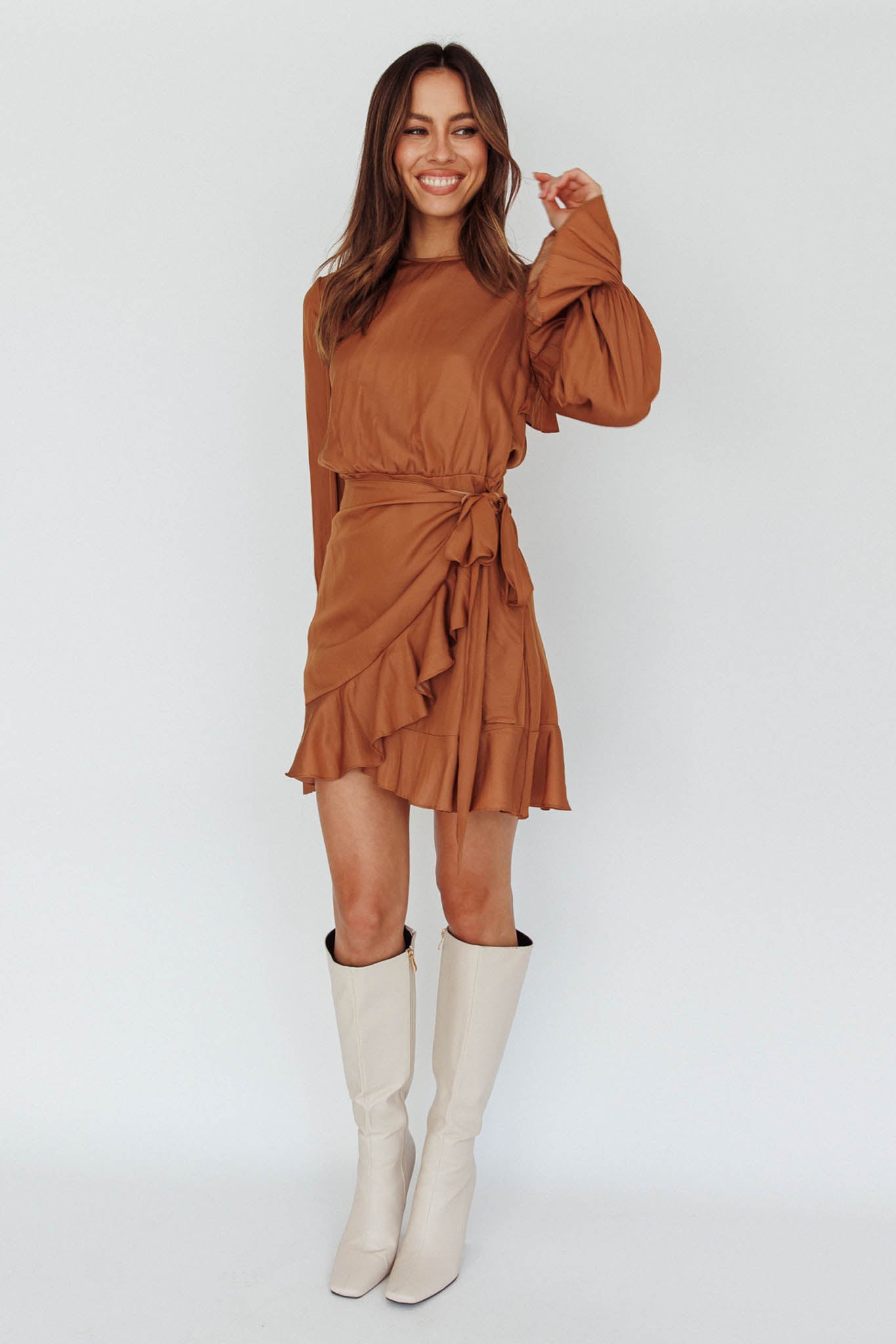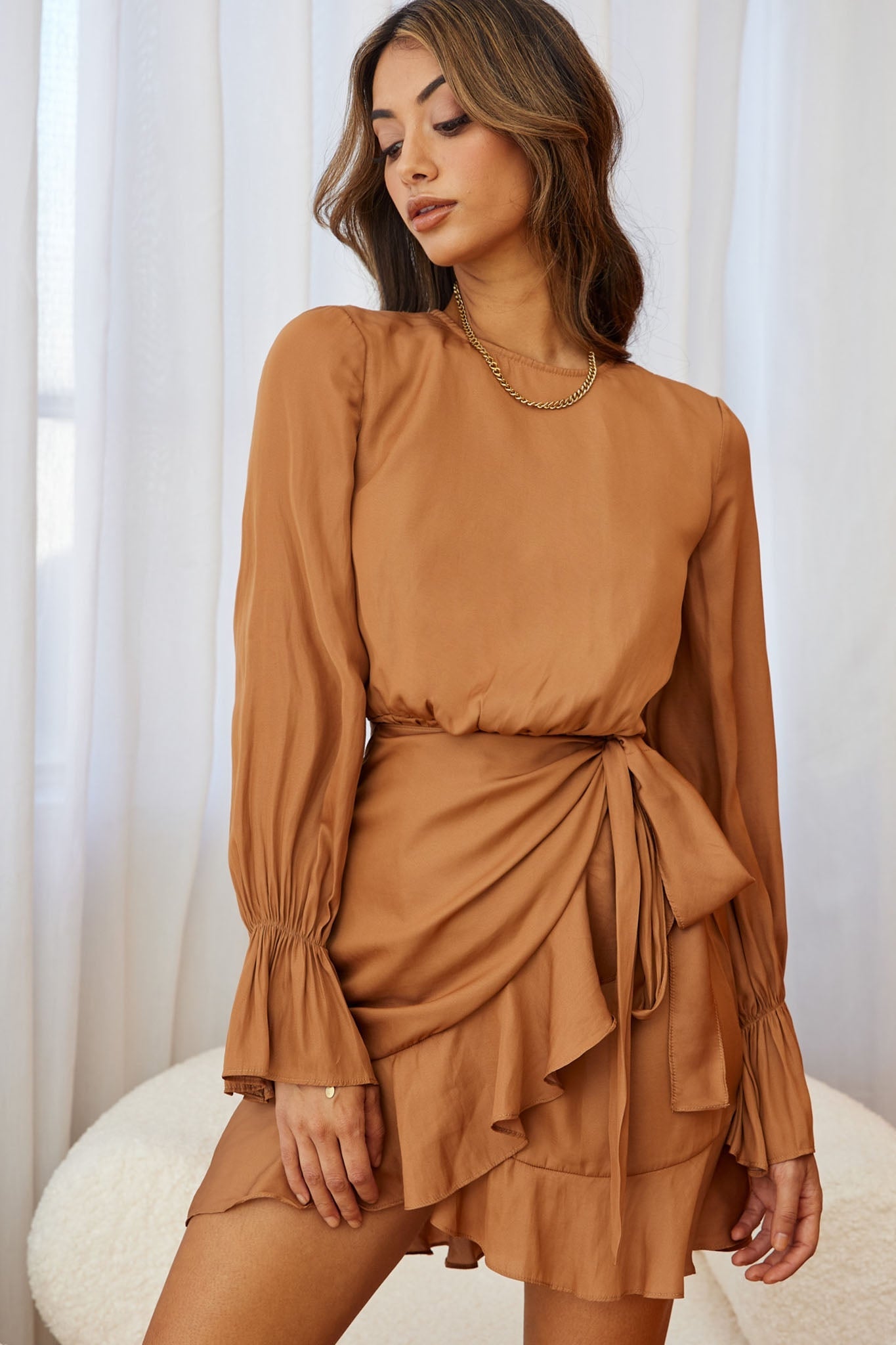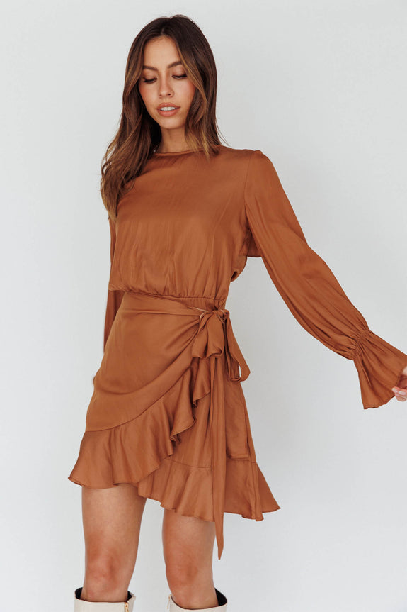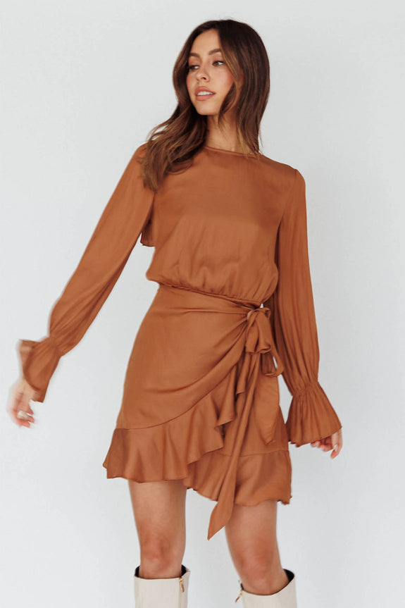 Dance the night away in this satin wrap bottom dress that ties at the waist and is completed with a ruffle-trimmed hemline. We are loving the open back detail to show just the right amount of skin. Team it with statement earrings and strappy heels as you sashay your way across the dance floor, in full view of Mr. Tall, Dark and Handsome.