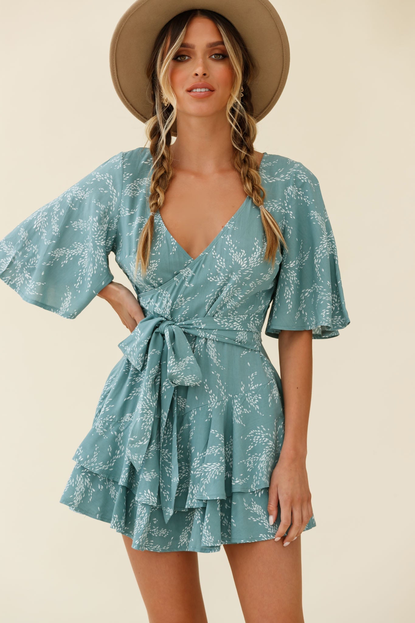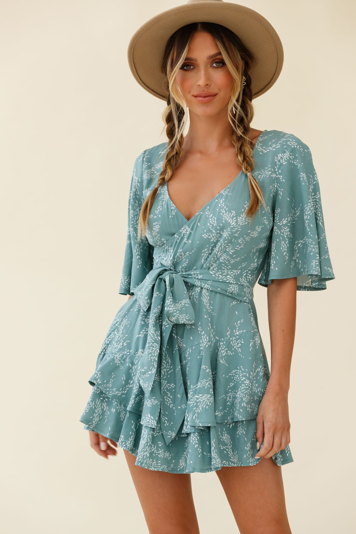 Davina Angel Sleeve Cut-Out Back Romper Leaf Print Sage