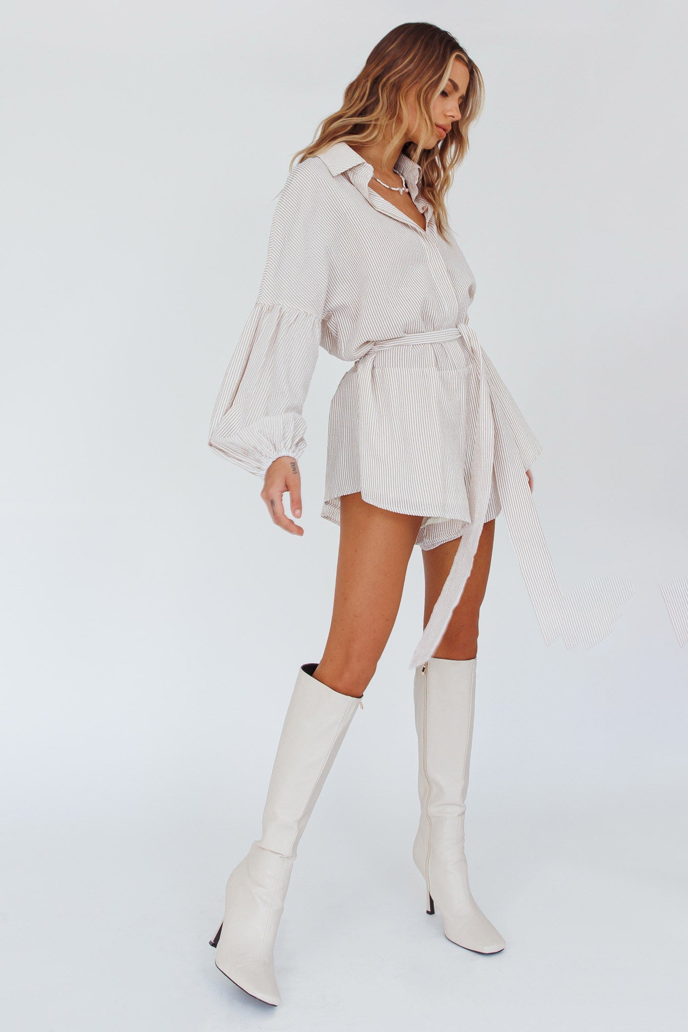 Daytona Beach Long Sleeve Shirt Romper Beige Stripe